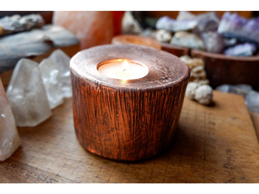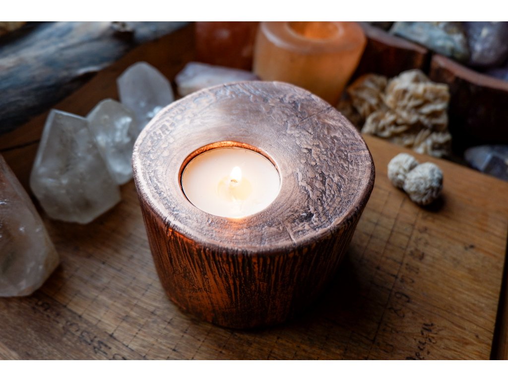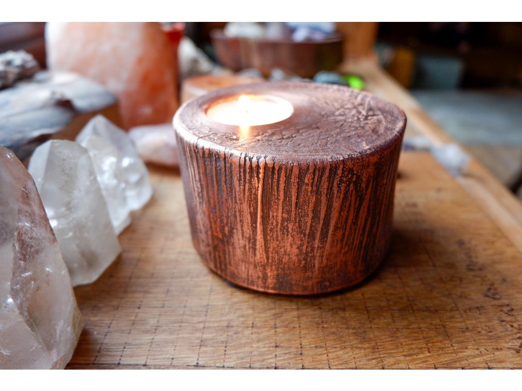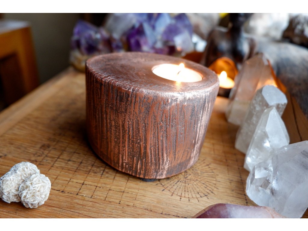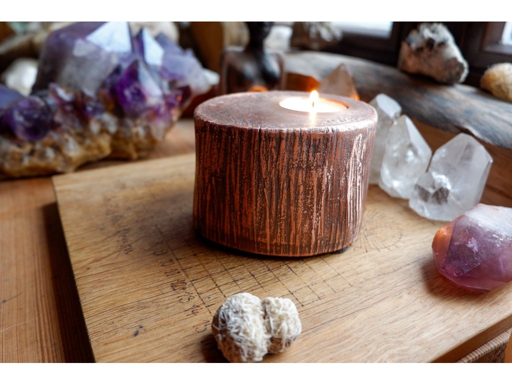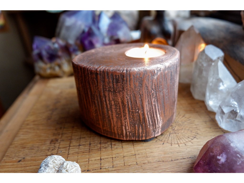 Svícen je vyroben z akátového masivu a mědi galvanizační technikou.