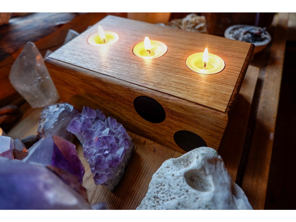 Svícen je vytvořený z dubu s intarzií ebenu.