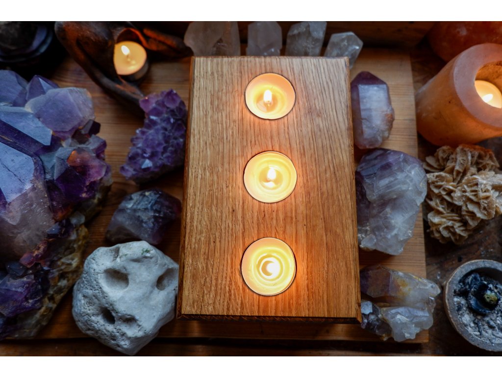 Svícen je vytvořený z dubu s intarzií ebenu.