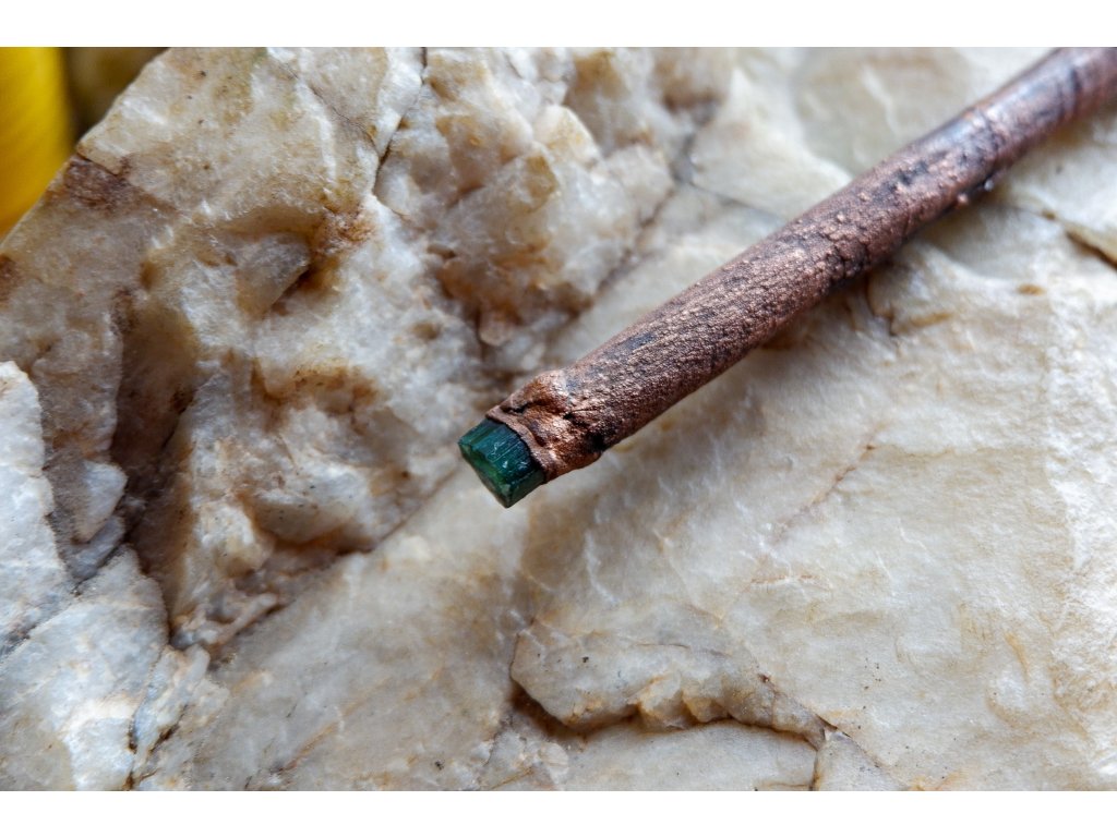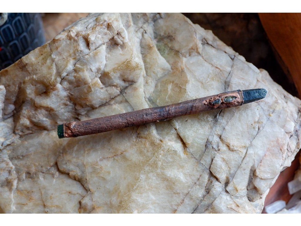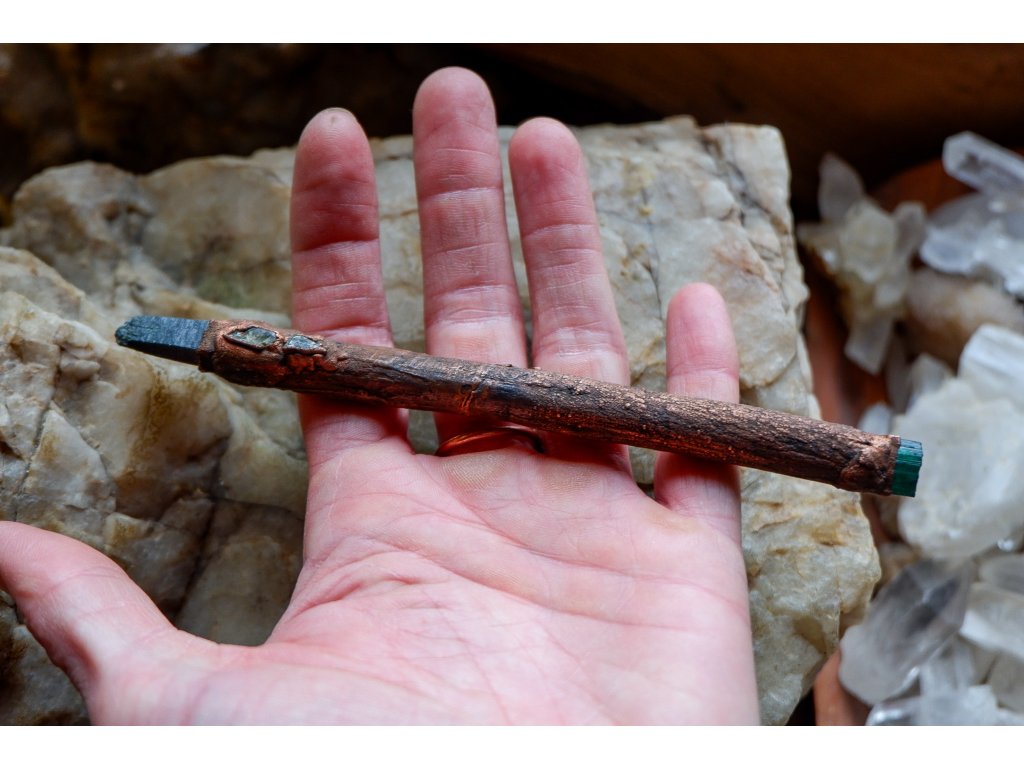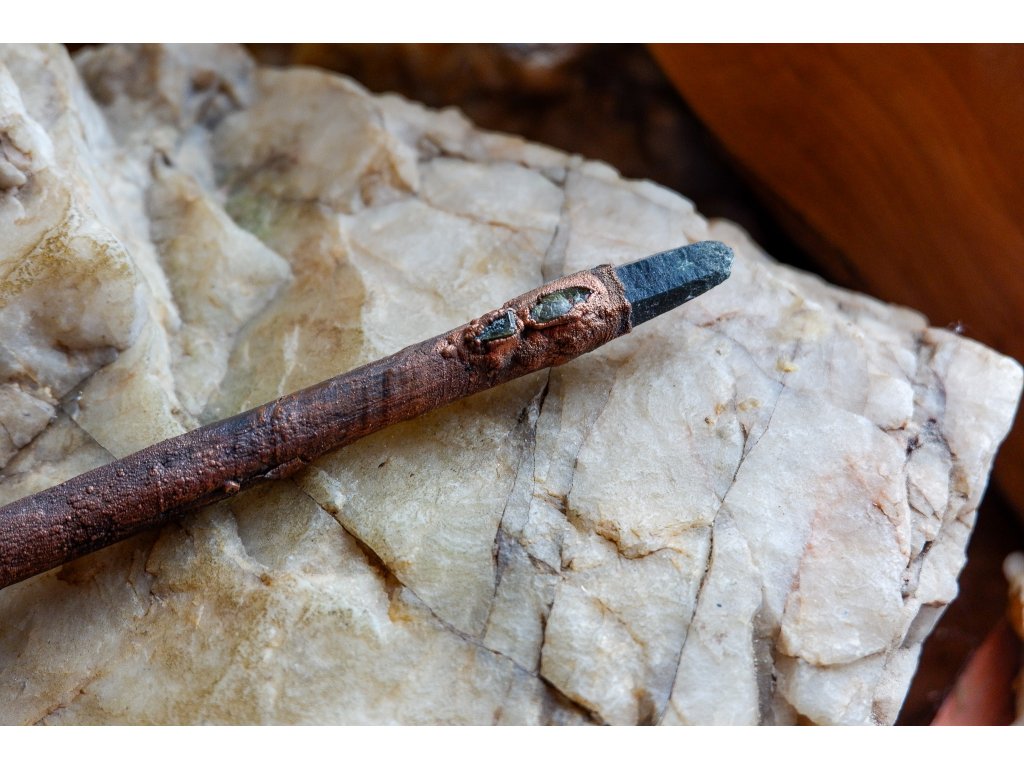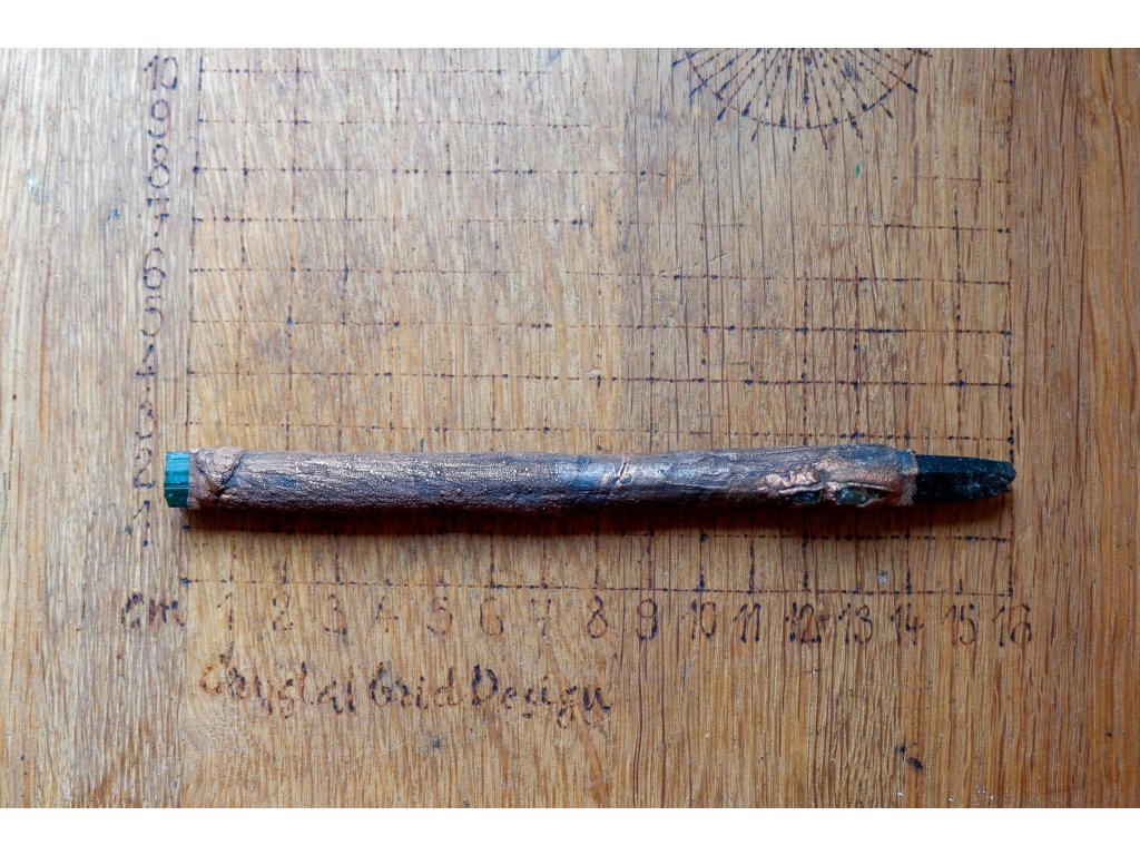 Hůlka je vytvořená galvanizační technikou (electroforming) z mědi, větvičky ze smrku, zeleného křišťálu (prasemu), zeleného turmalínu a titanitů.