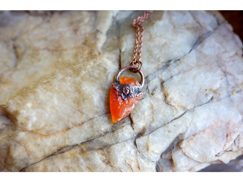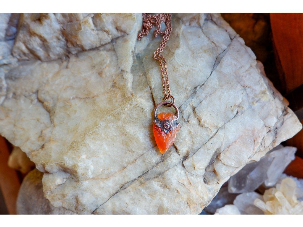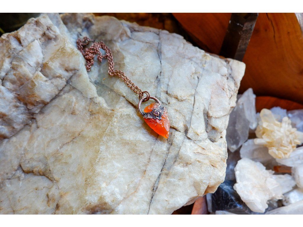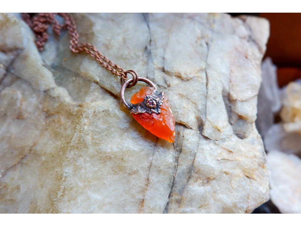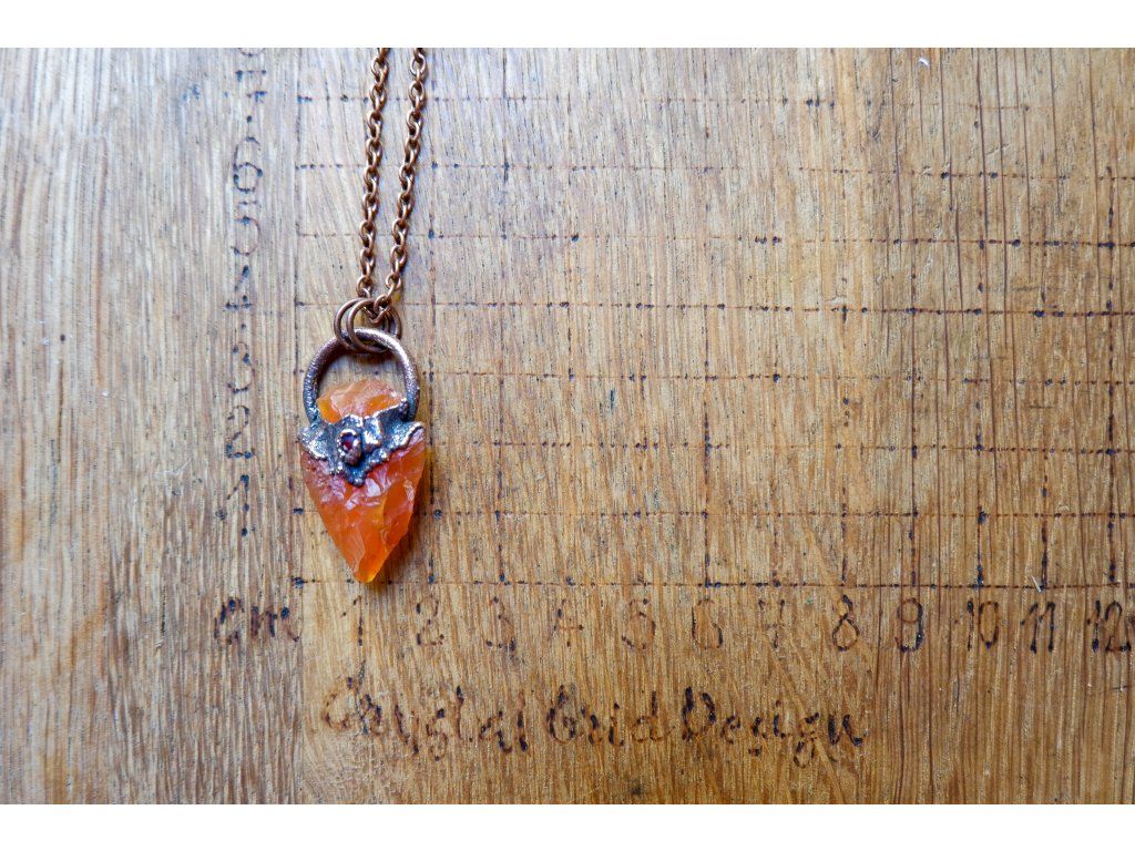 Přívěsek je vytvořený galvanizační technikou (electroforming) z mědi českého granátu a karneolu.