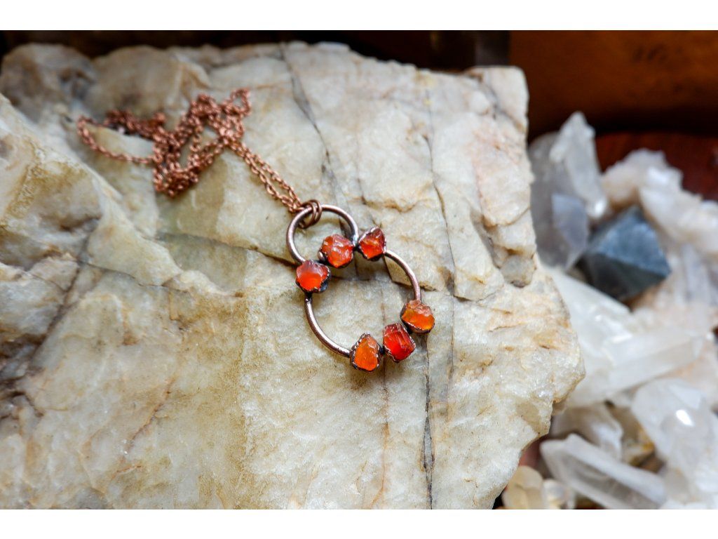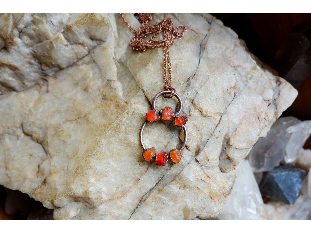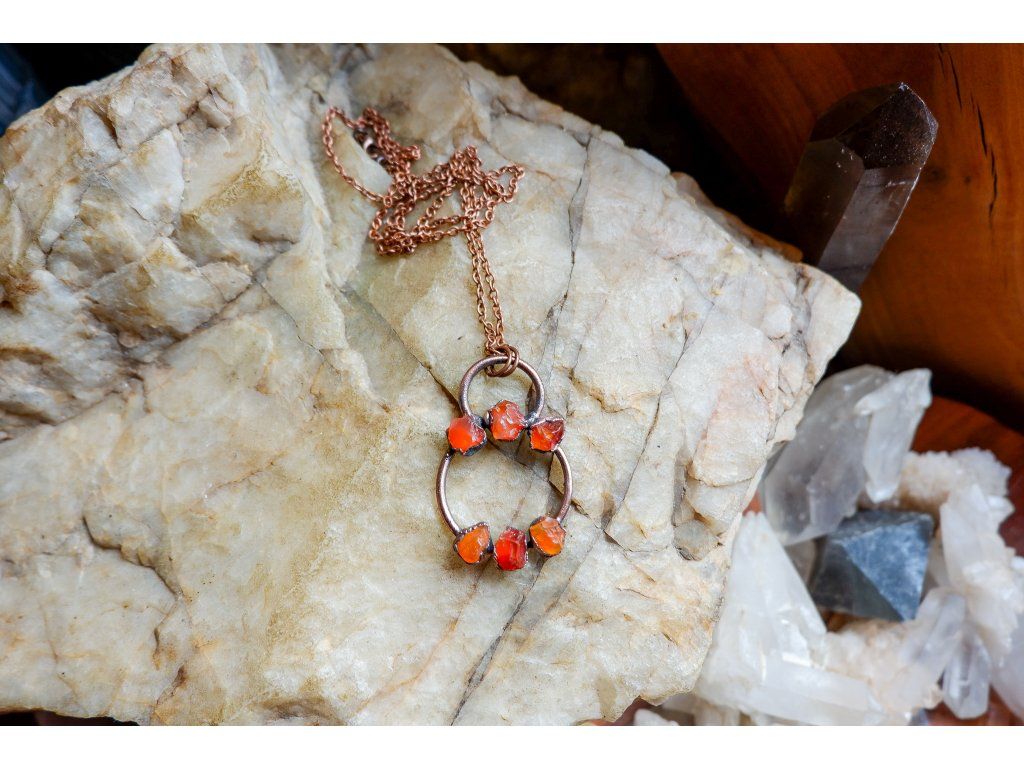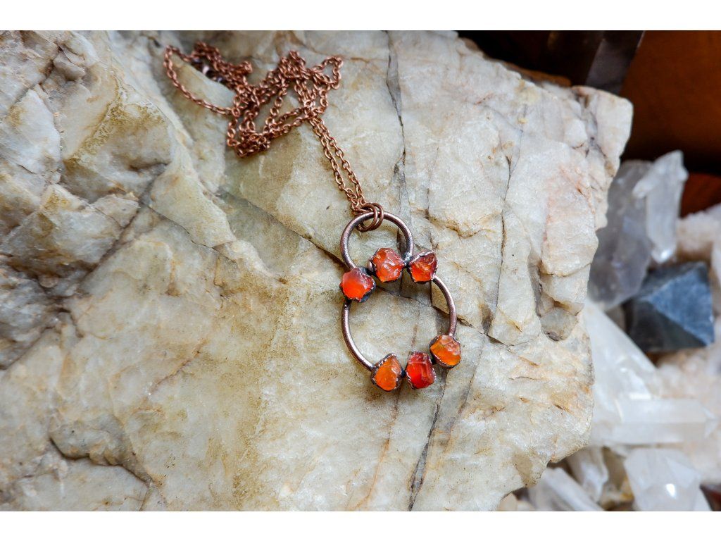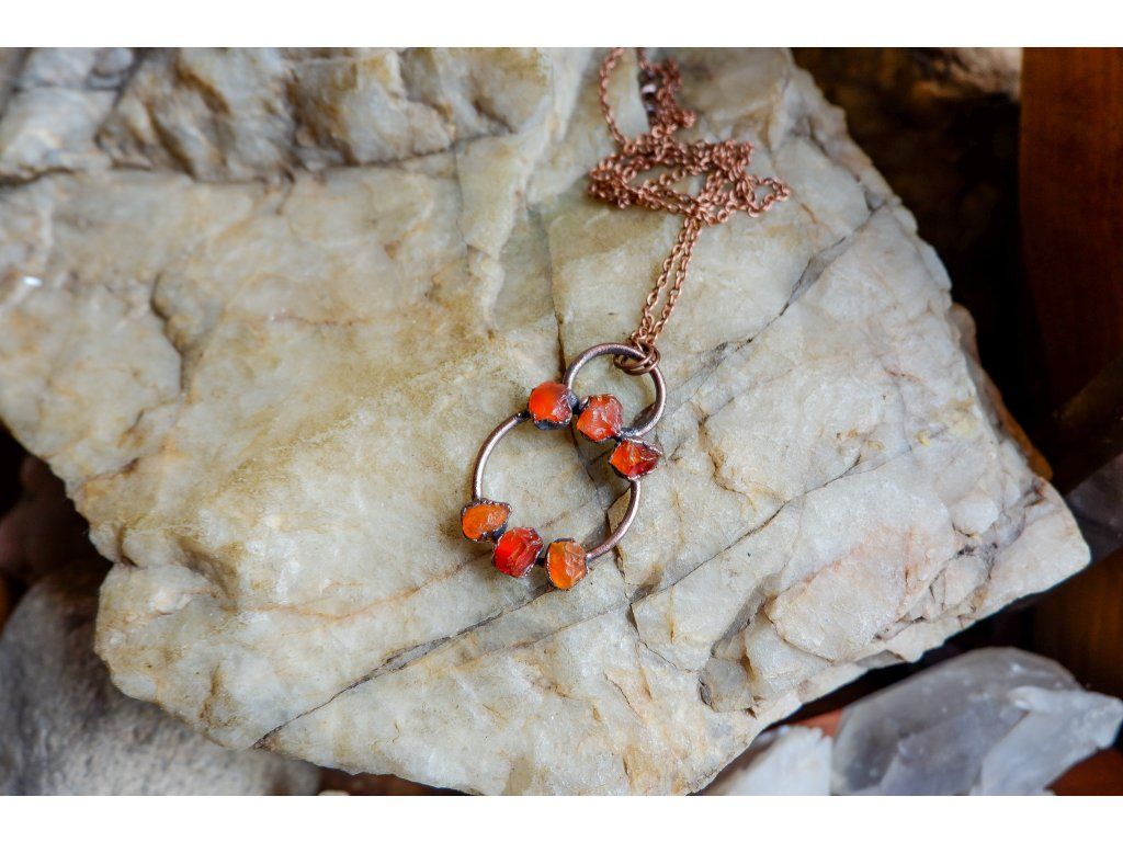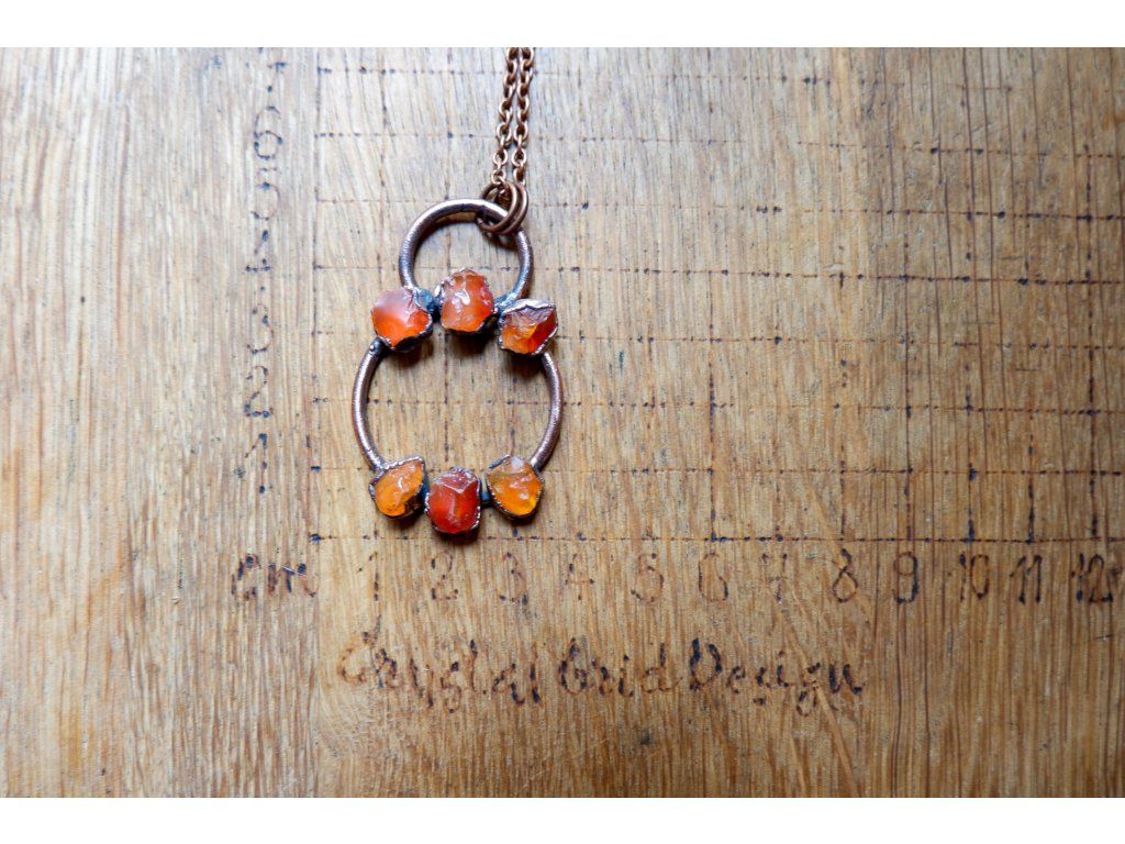 Přívěsek je vytvořený galvanizační technikou (electroforming) z mědi a karneolu.