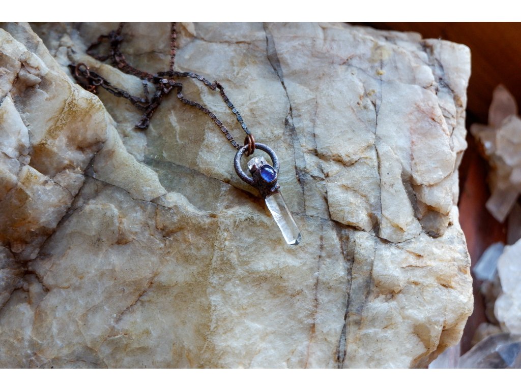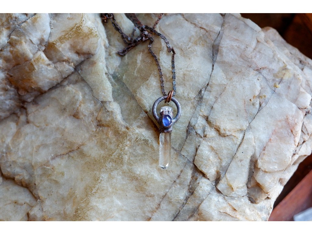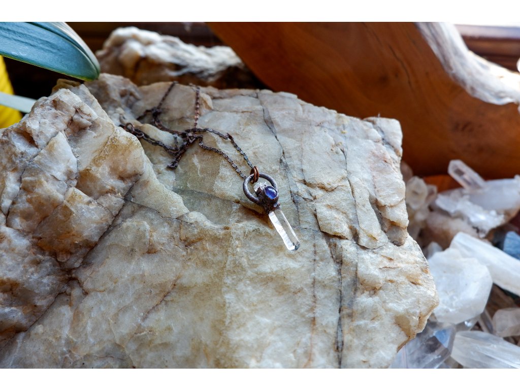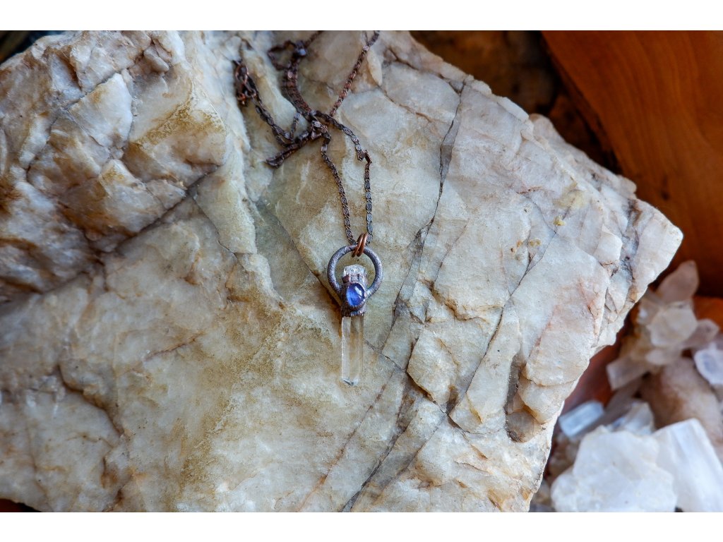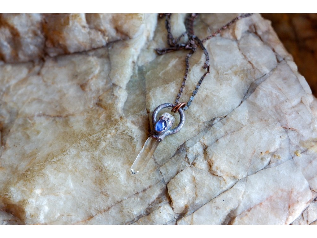 Přívěsek je vytvořený galvanizační technikou (electroforming) z mědi, křišťálu, fenakitu a tanzanitu.