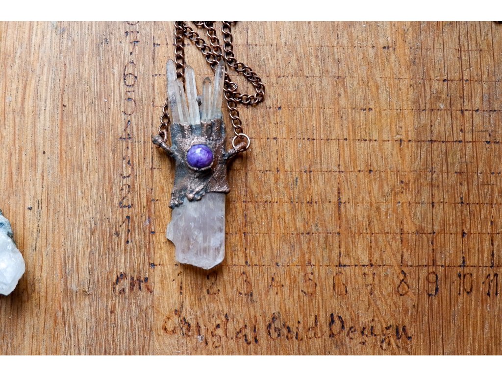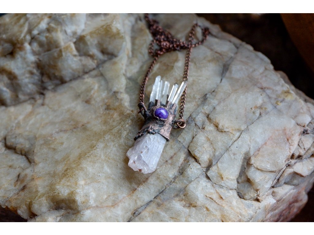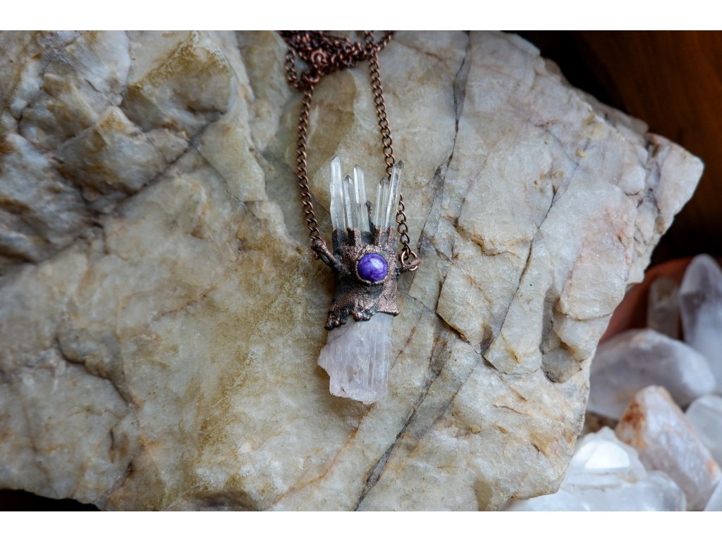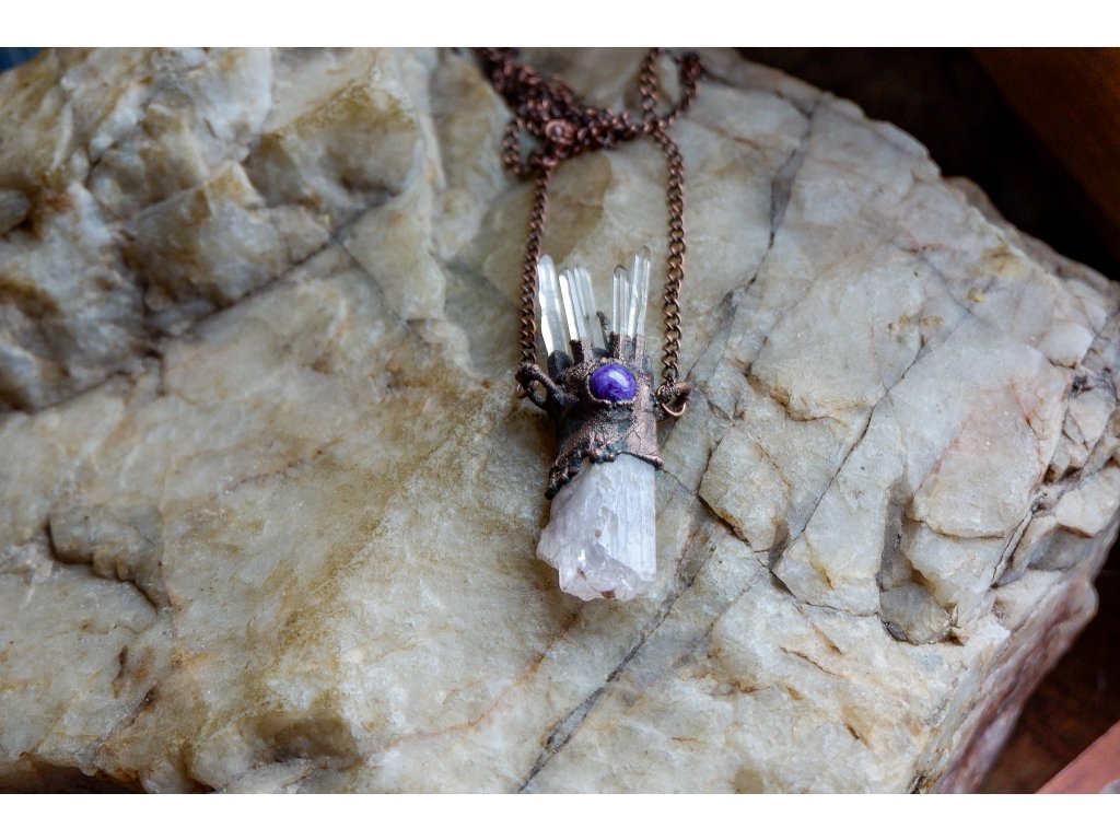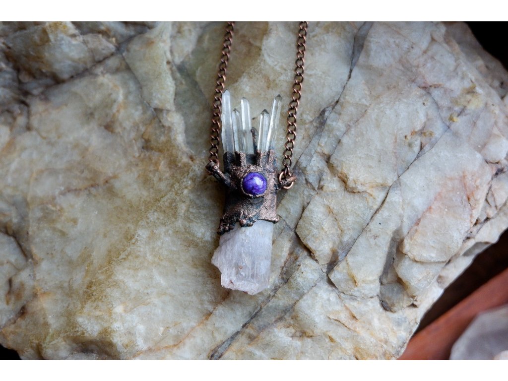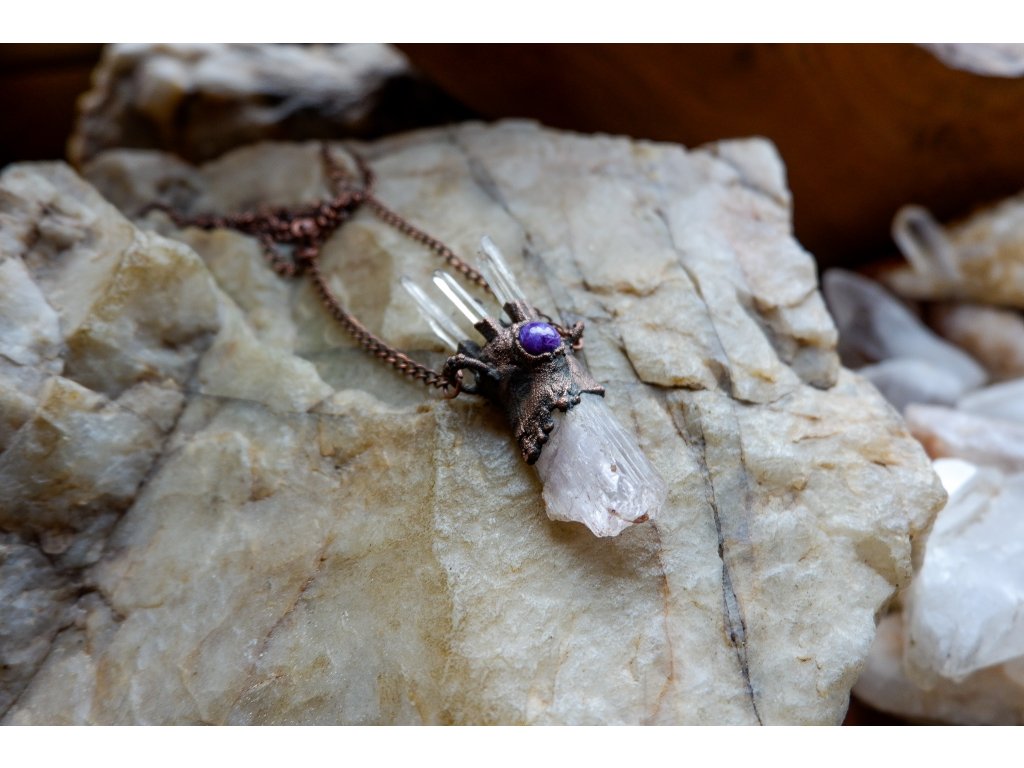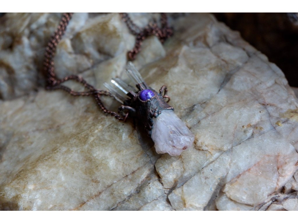 Přívěsek je vytvořený galvanizační technikou (electroforming) z mědi, kunzitu, křišťálu a turmalínu.