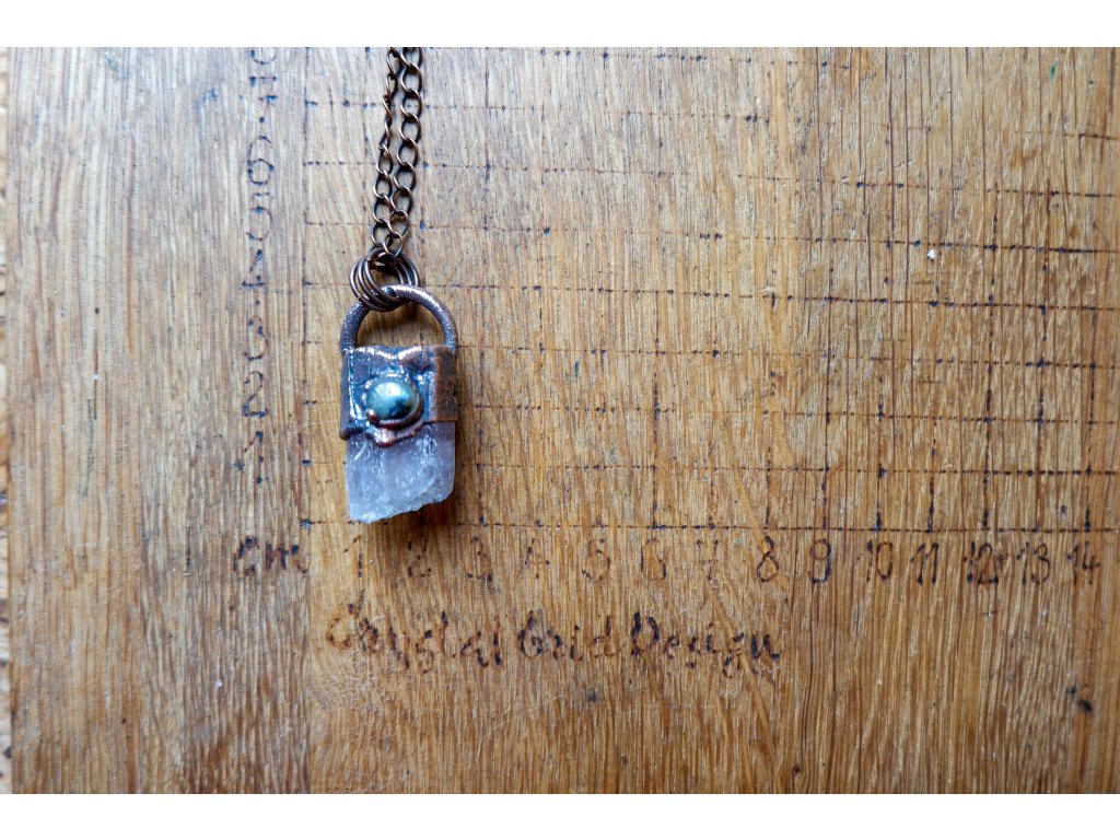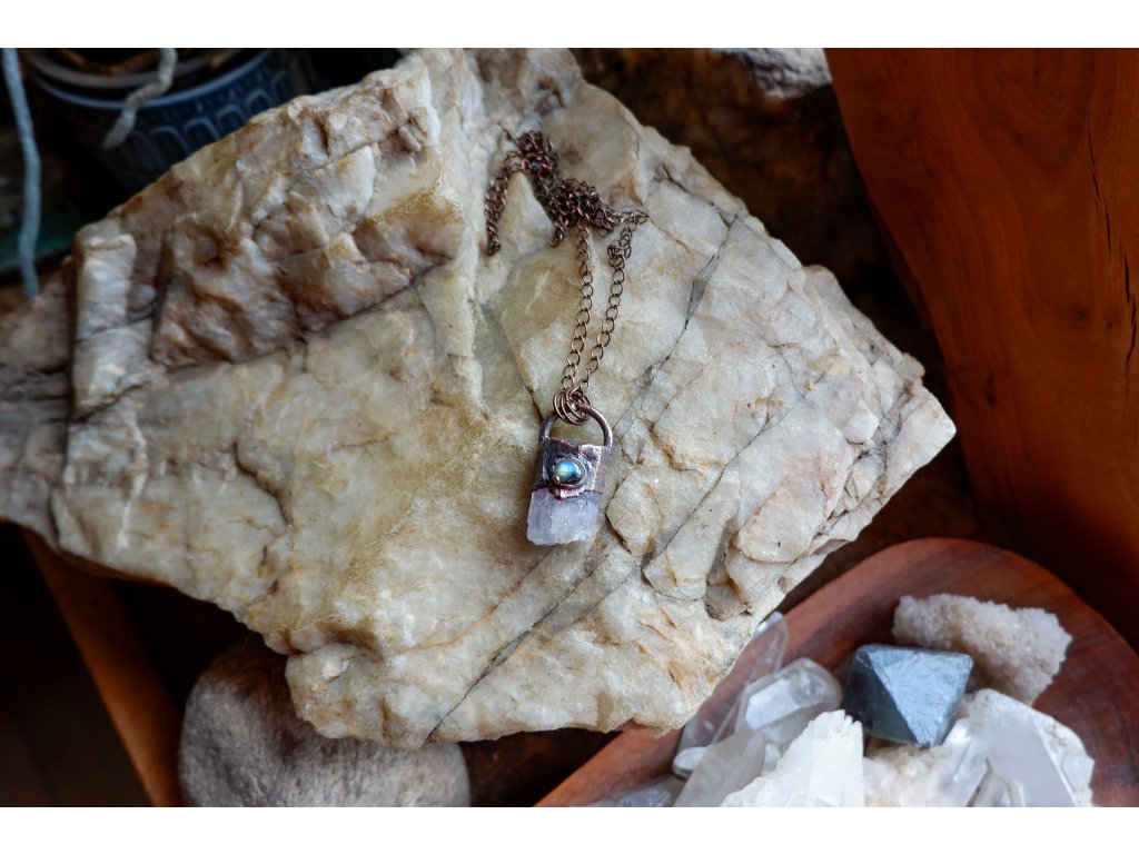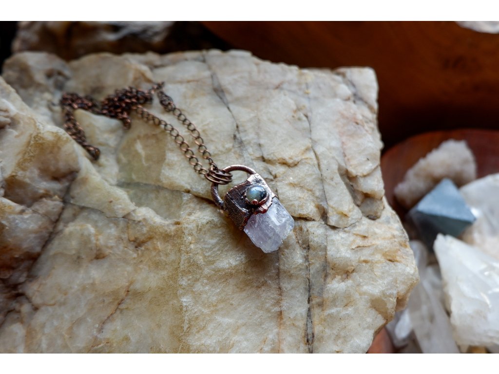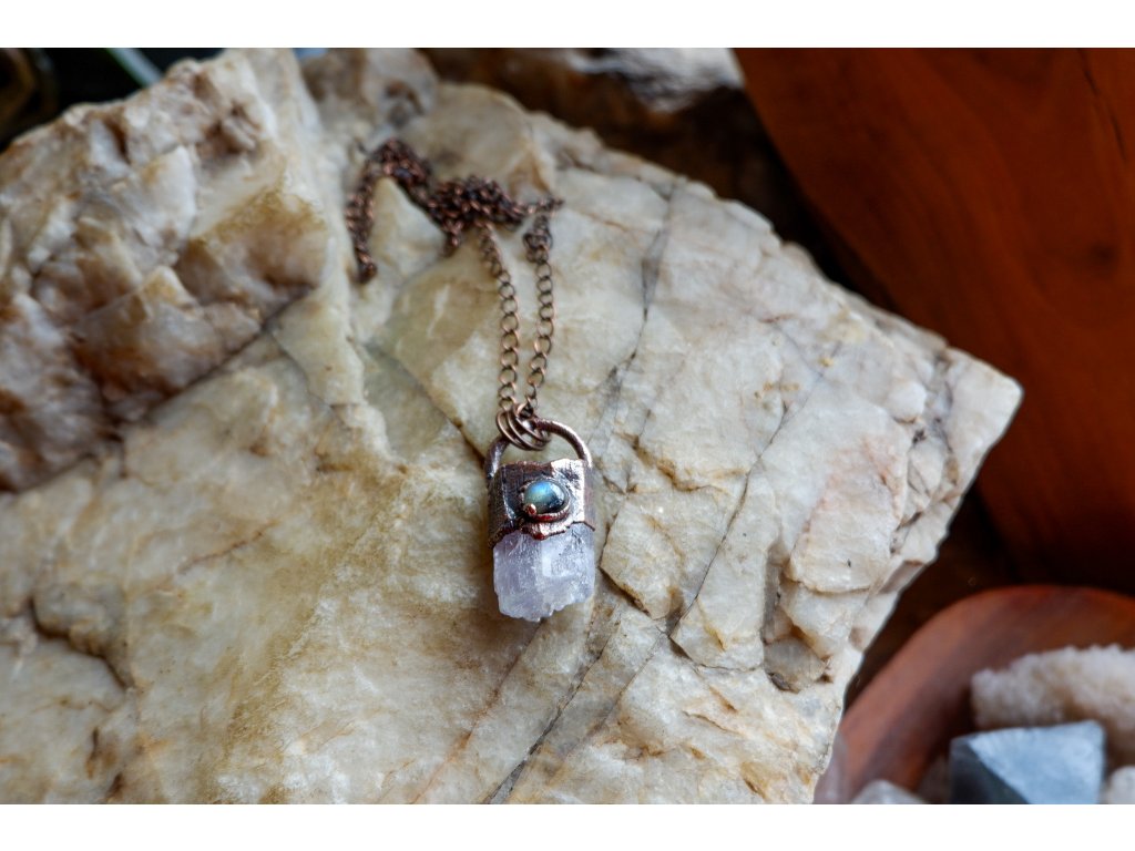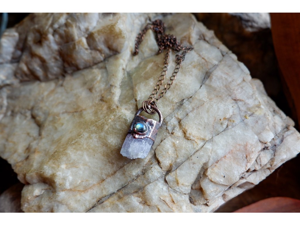 Přívěsek je vytvořený galvanizační technikou (electroforming) z mědi, kunzitu a labradoritu.