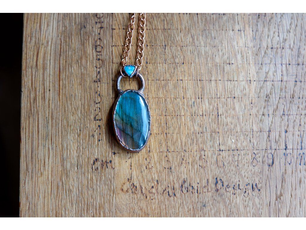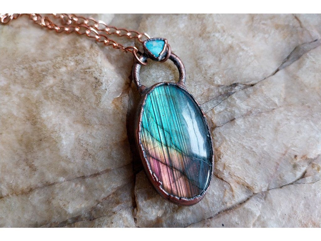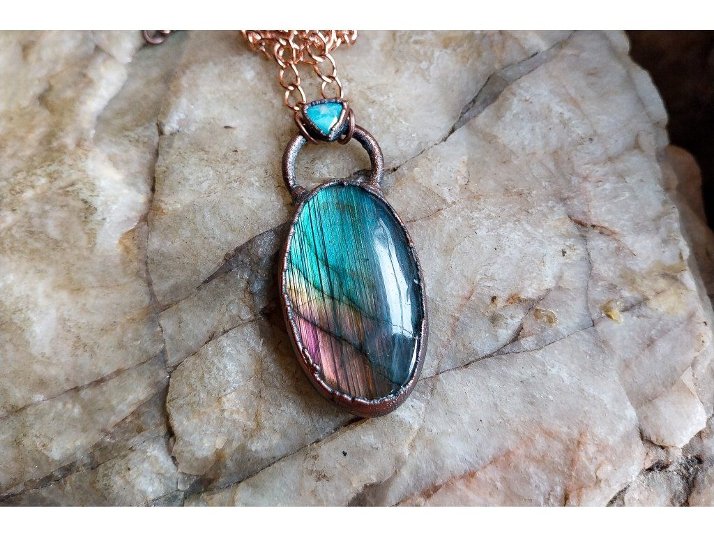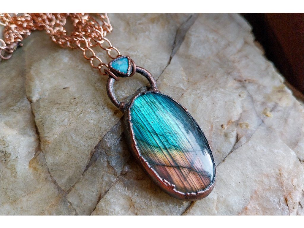 Přívěsek je vytvořený galvanizační technikou (electroforming) z mědi, labradoritu a apatitu.