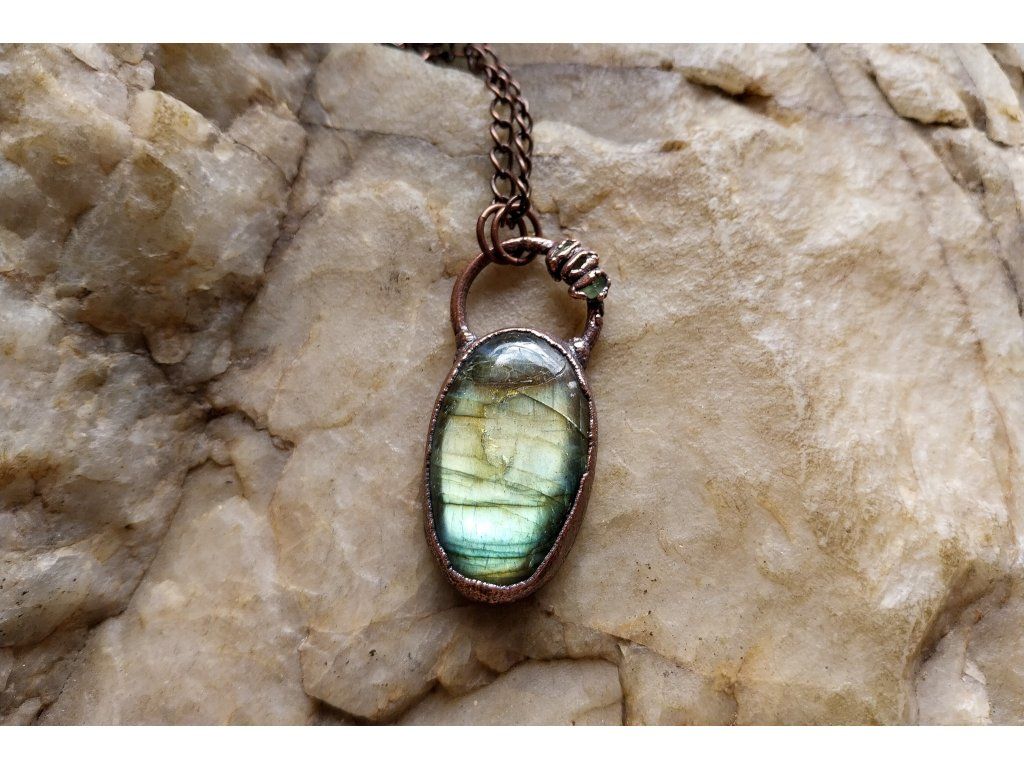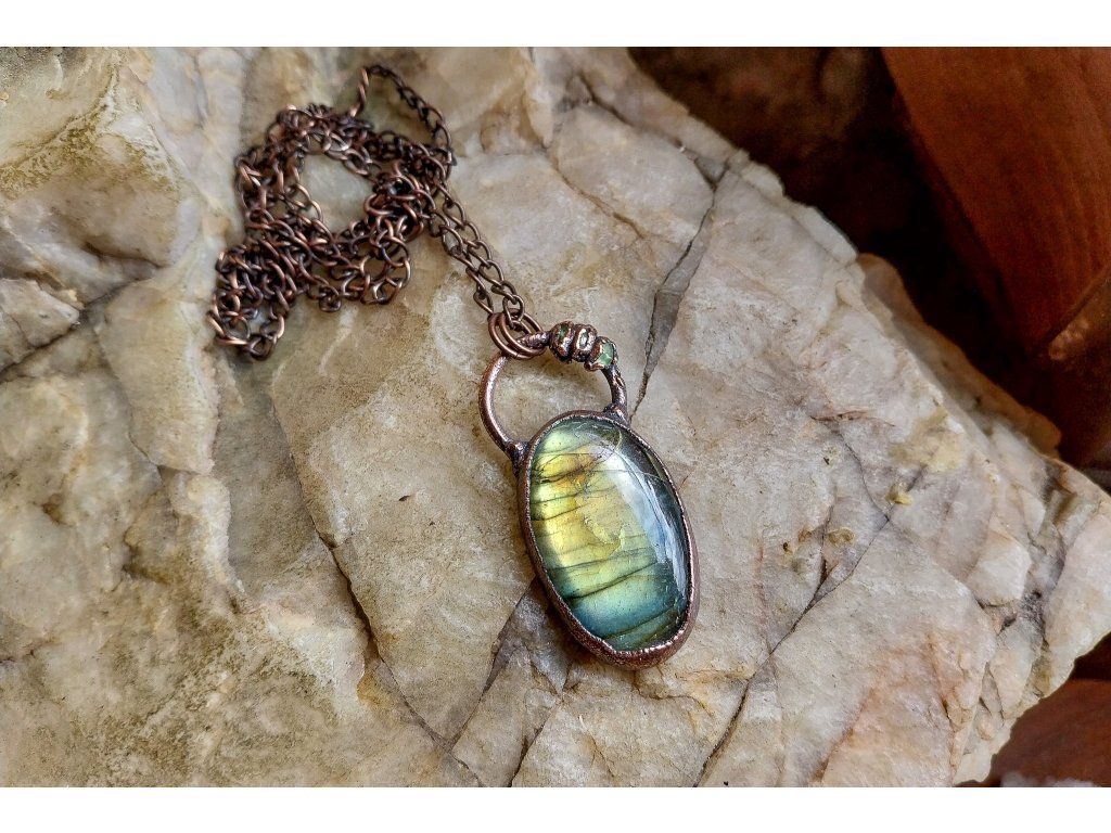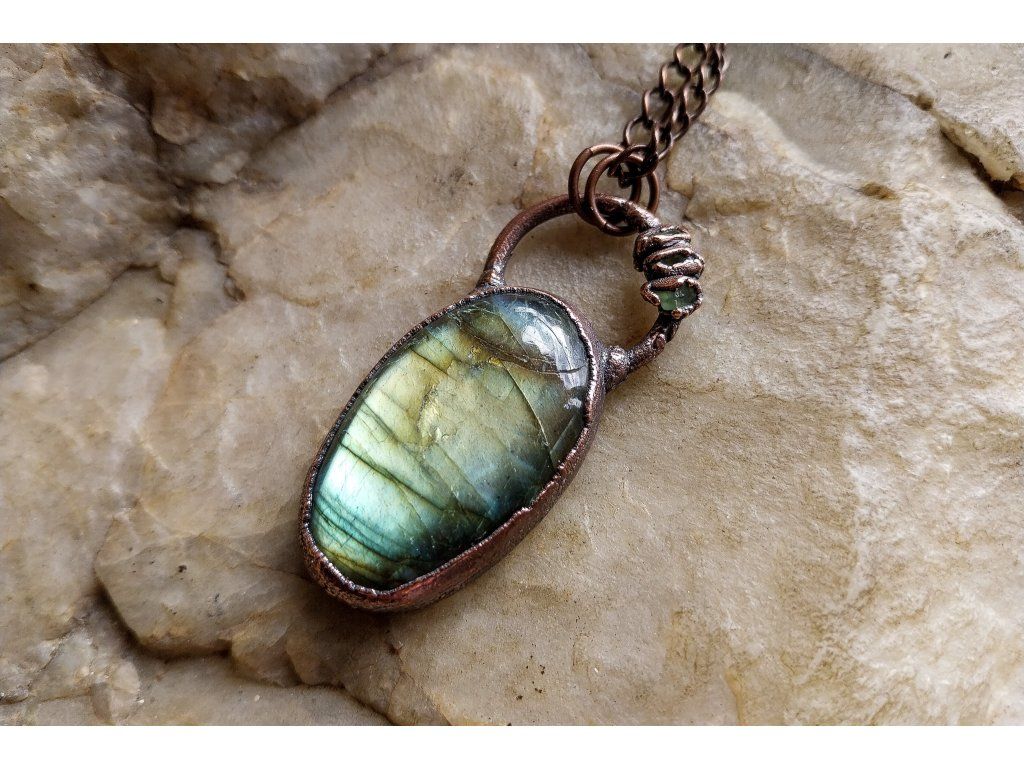 Přívěsek je vytvořený galvanizační technikou (electroforming) z mědi, labradoritu a peridotu.