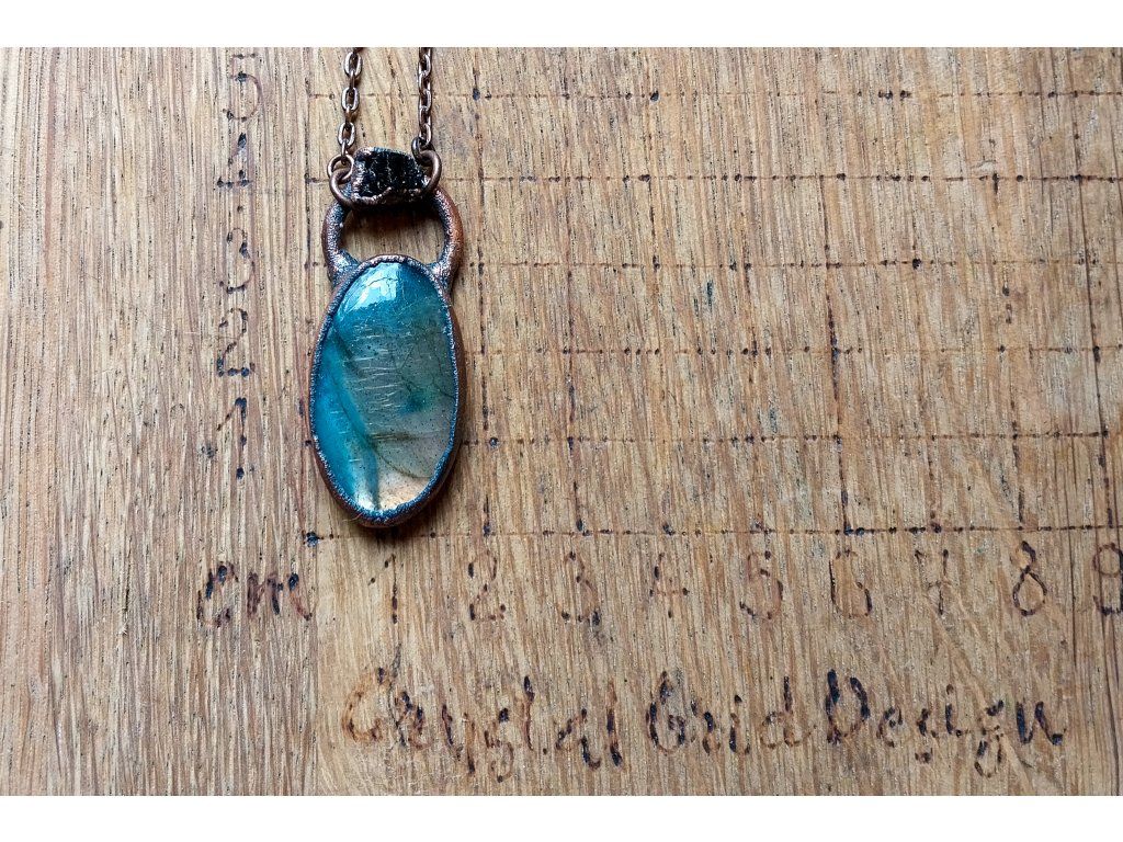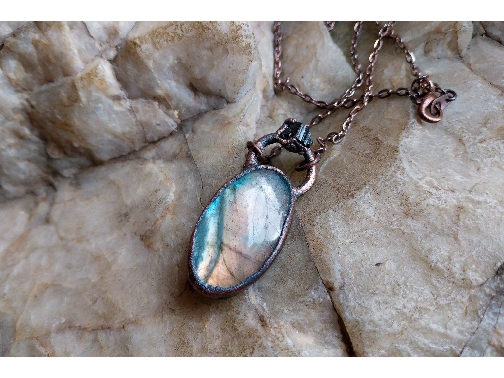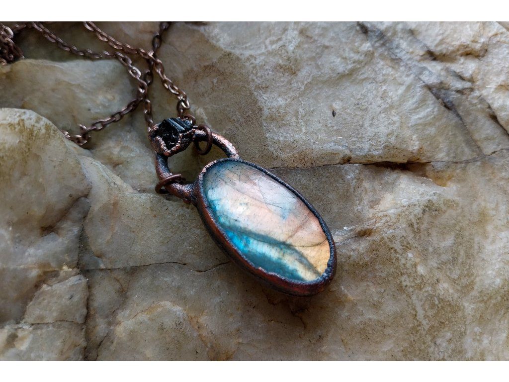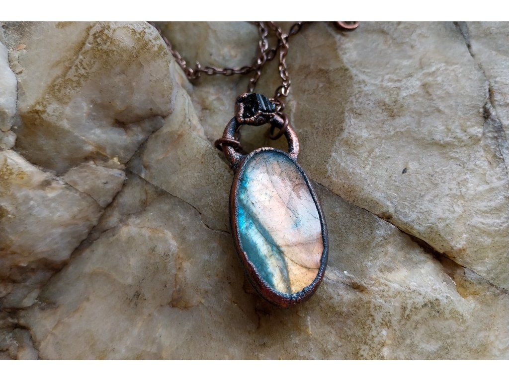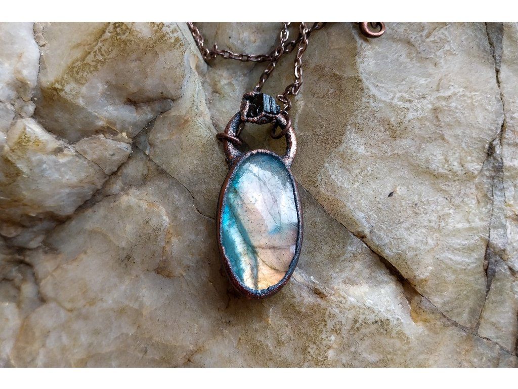 Přívěsek je vytvořený galvanizační technikou (electroforming) z mědi, labradoritu a apatitu.