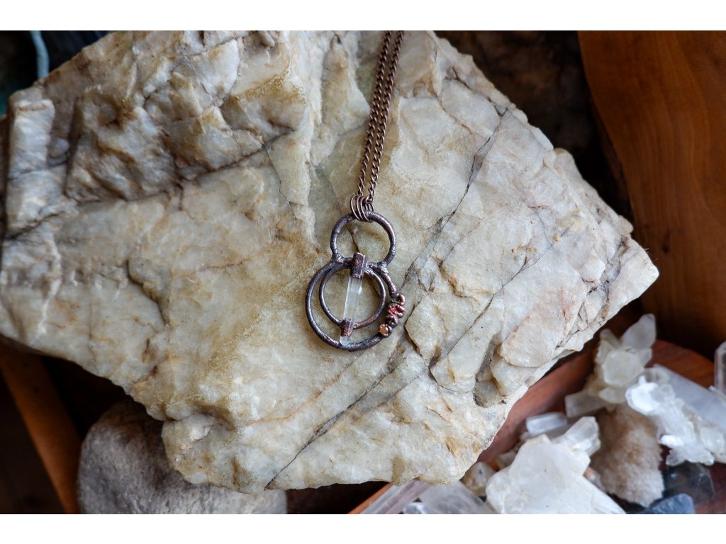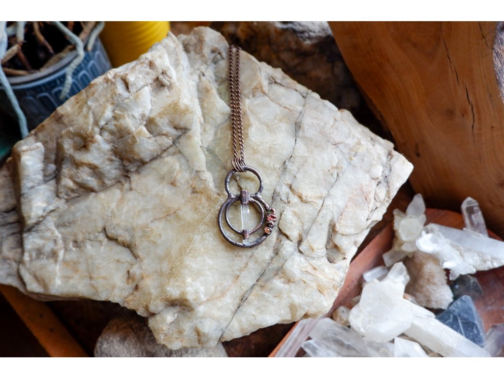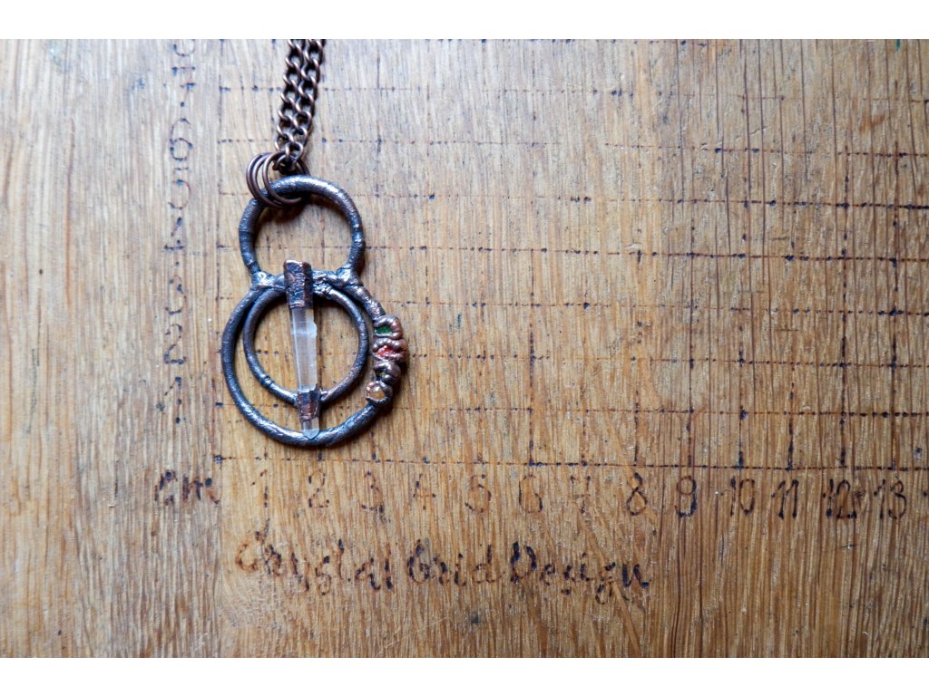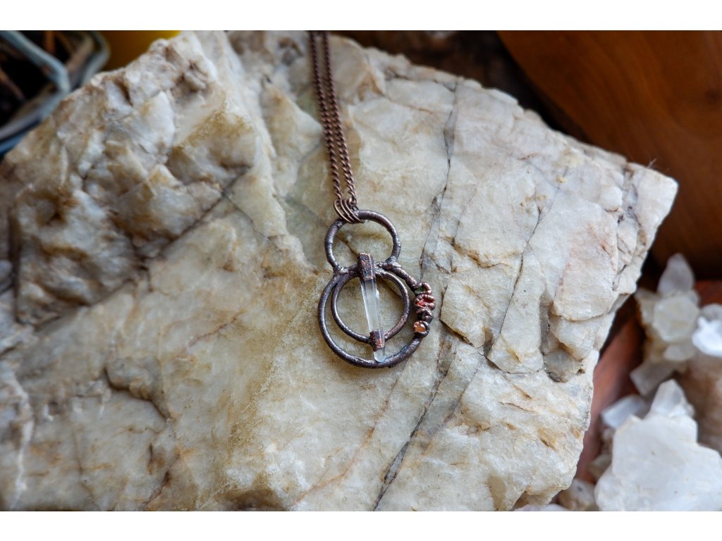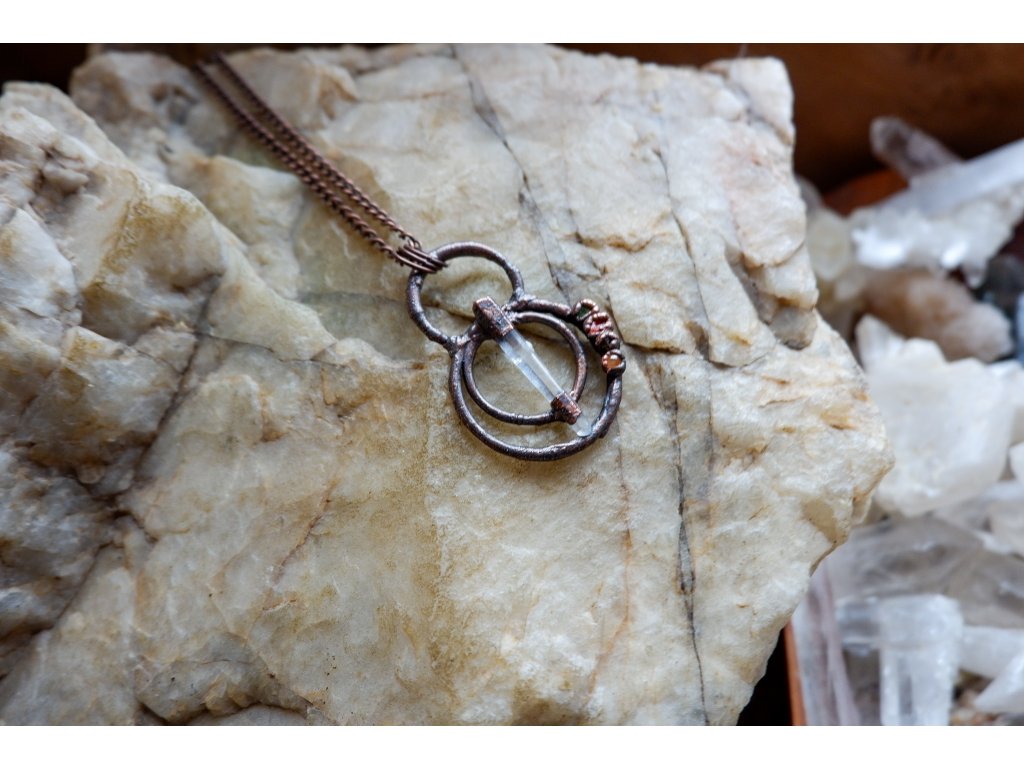 Přívěsek je vytvořený galvanizační technikou (electroforming) z mědi, laserového křišťálu, peridotu, dravitem, vanadinitu a žlutého aventurínu.