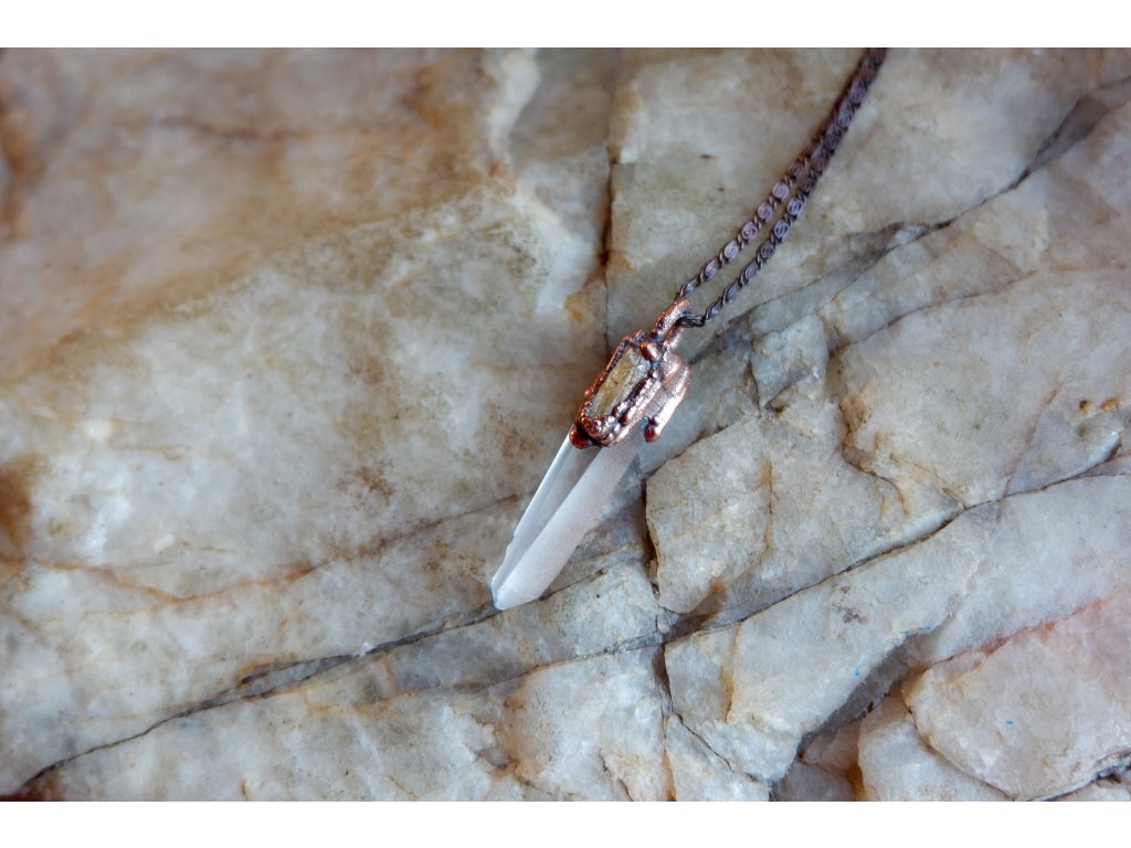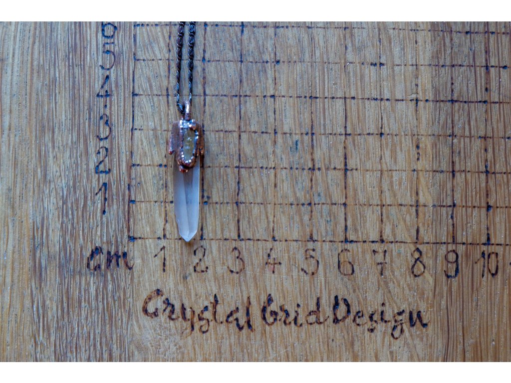Přívěsek je vytvořený galvanizační technikou (electroforming) z mědi, lemurského křišťálu a topazu.