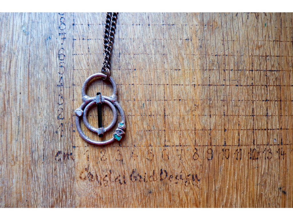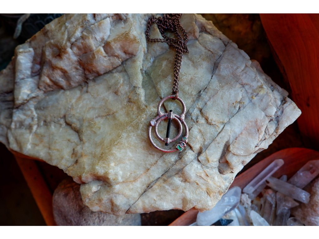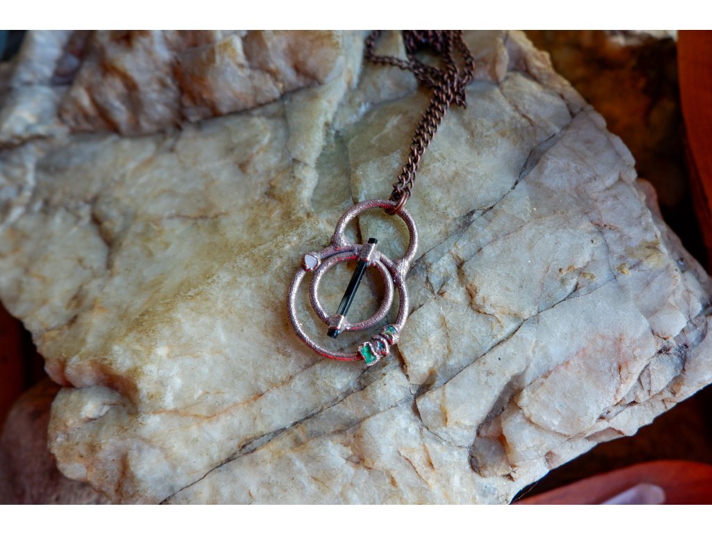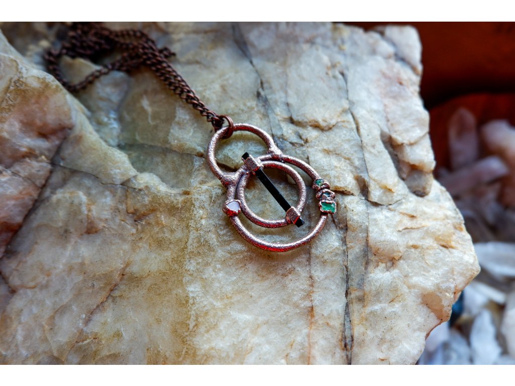 Přívěsek je vytvořený galvanizační technikou (electroforming) z mědi, morganitu, skoruylu (černého turmalínu) a smaragdu.