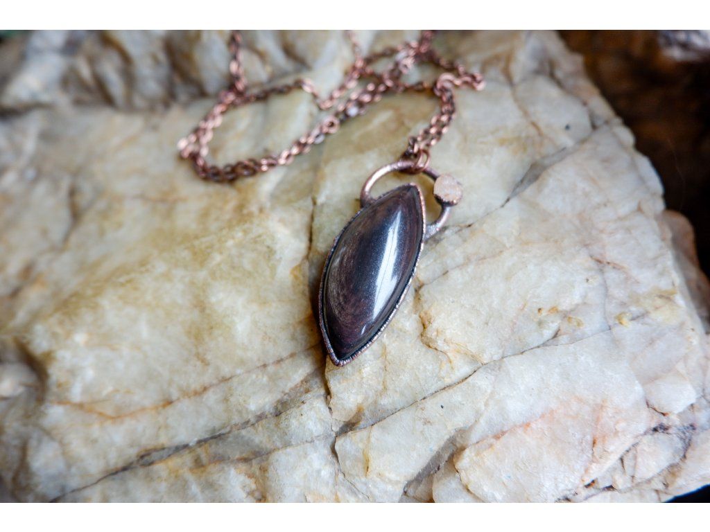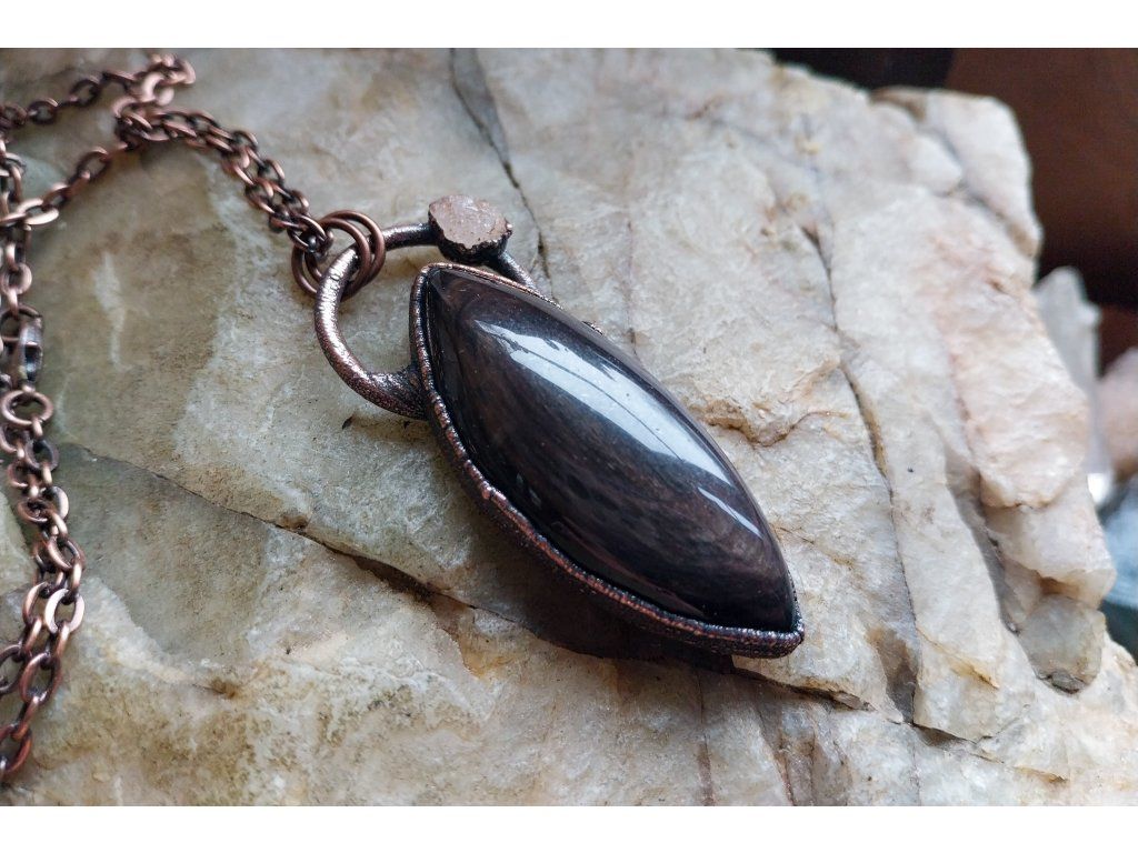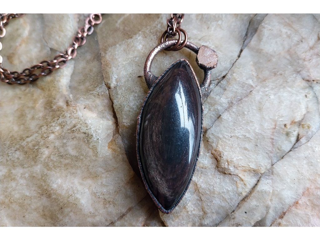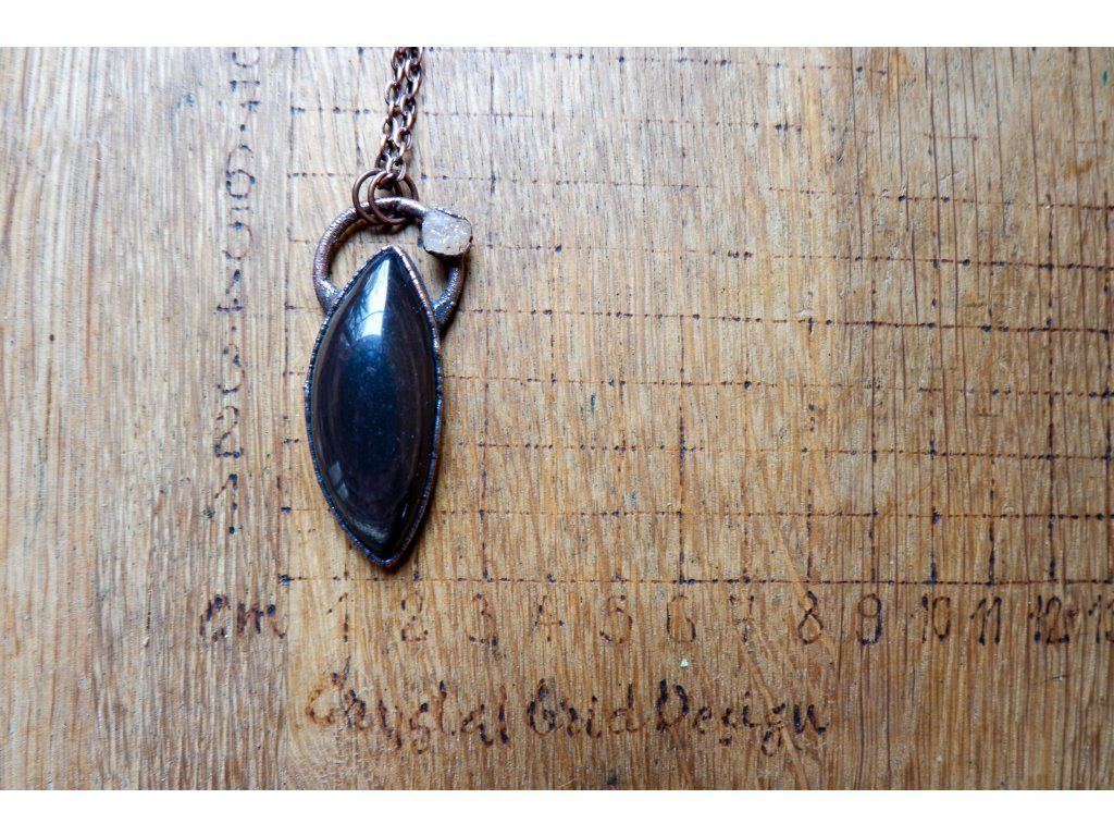 Přívěsek je vytvořený galvanizační technikou (electroforming) z mědi, heliodoru a obsidiánu.