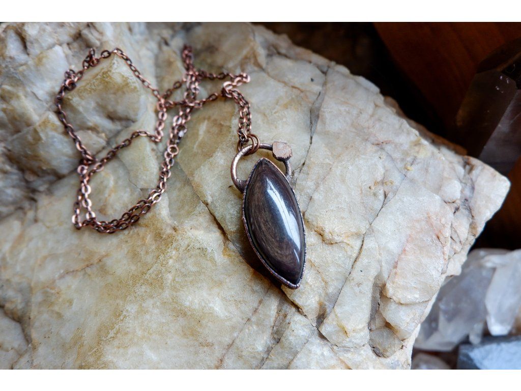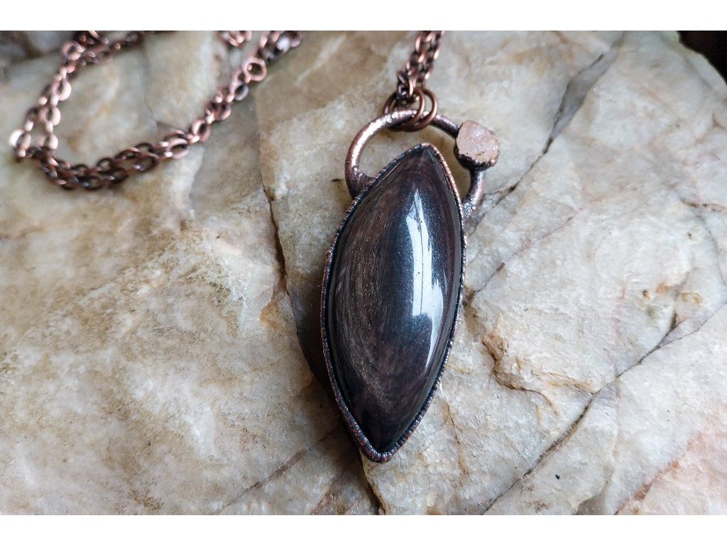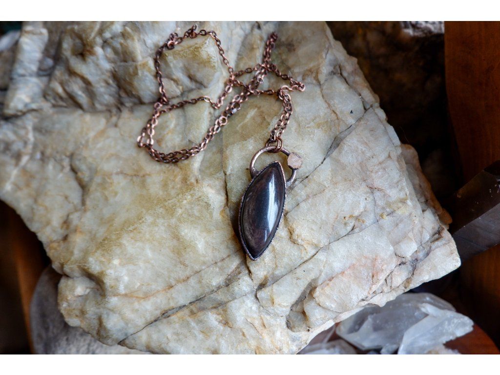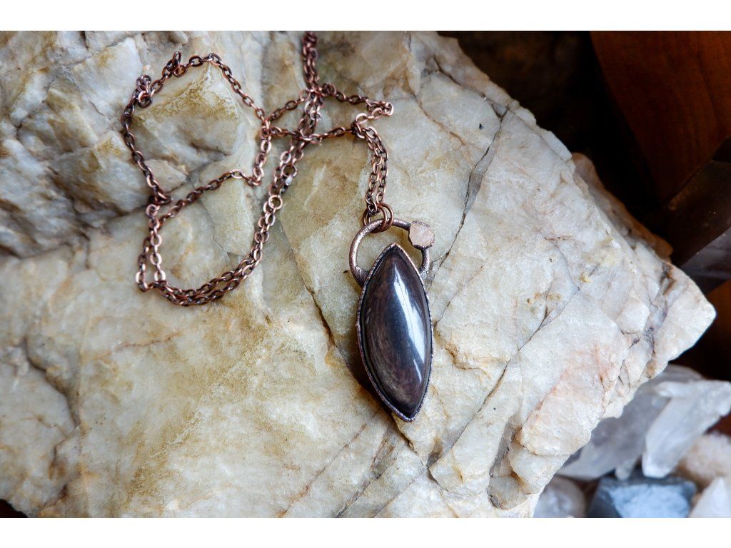 Přívěsek je vytvořený galvanizační technikou (electroforming) z mědi, heliodoru a obsidiánu.