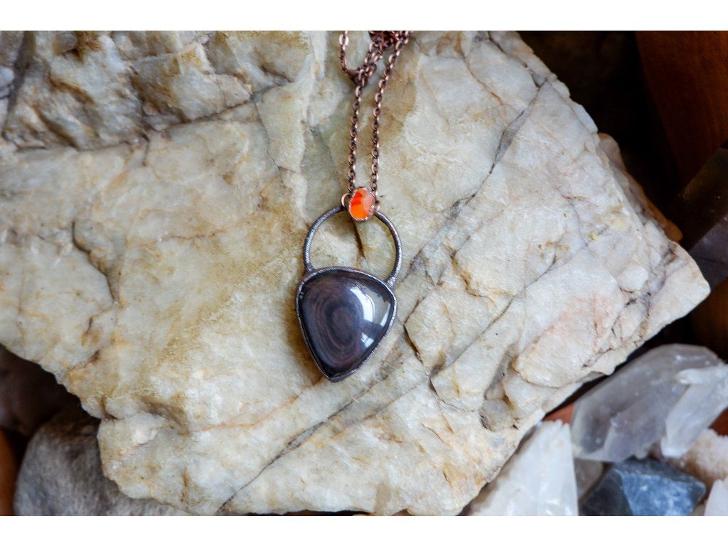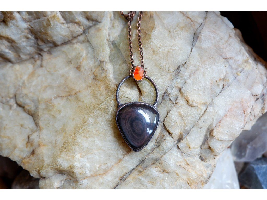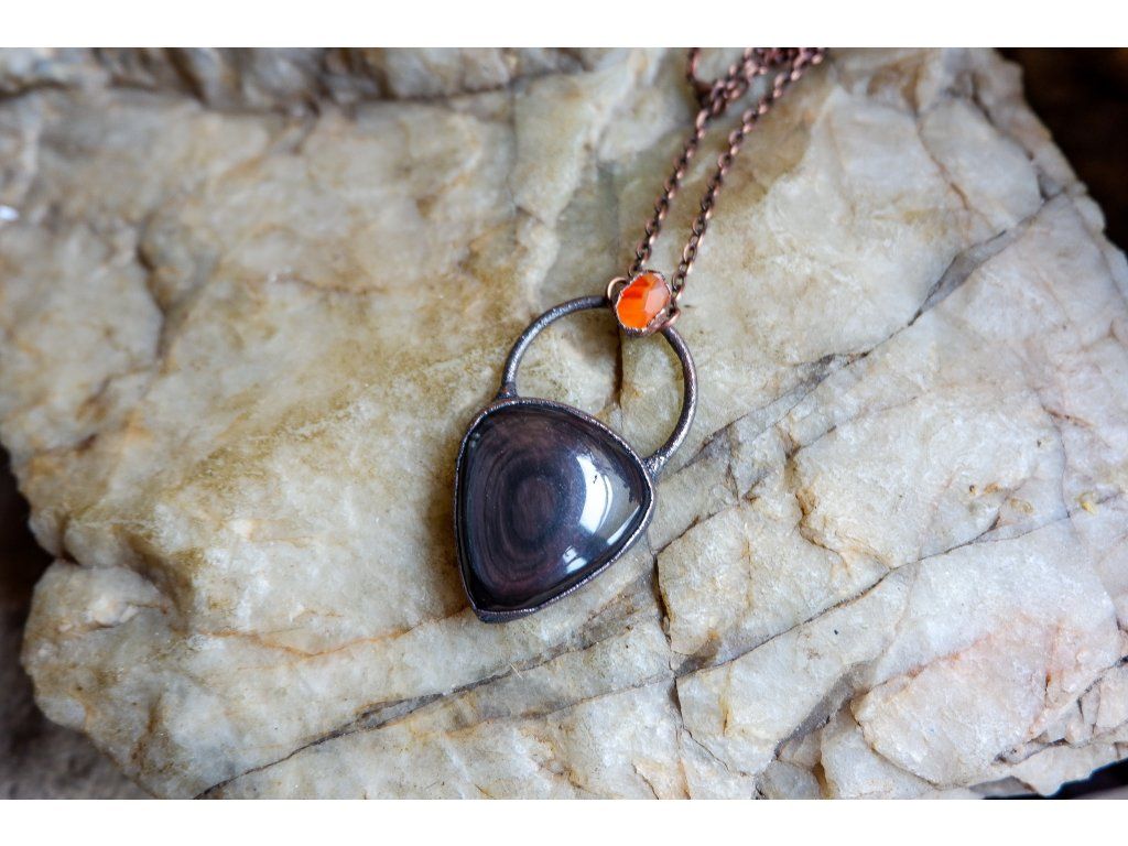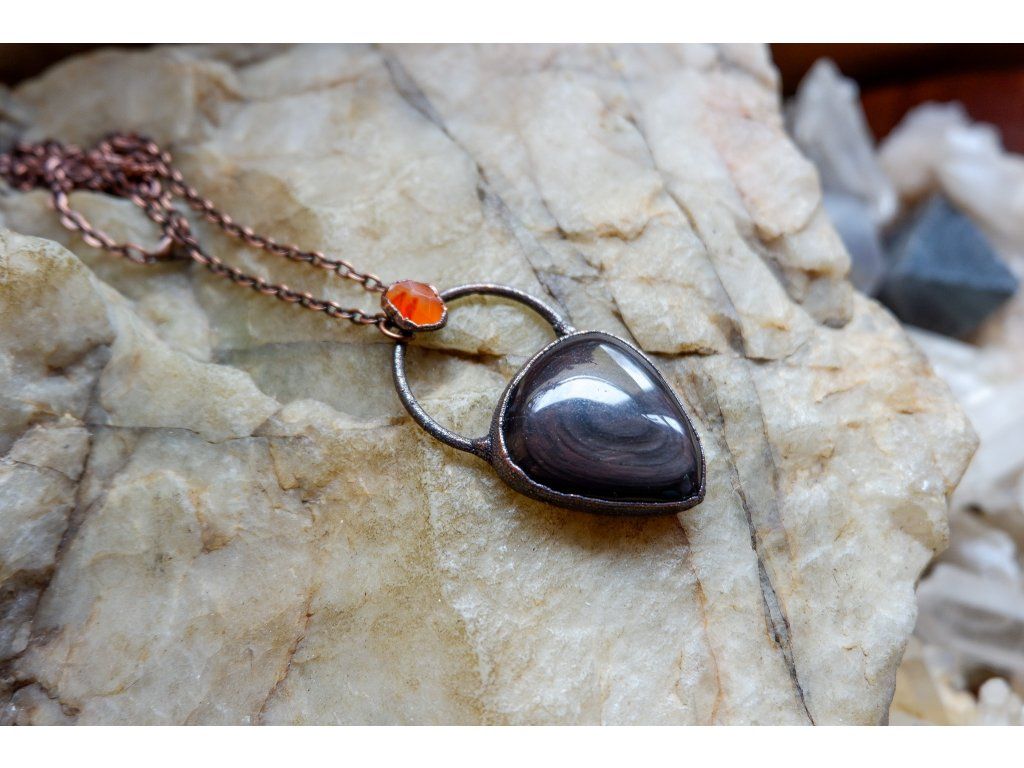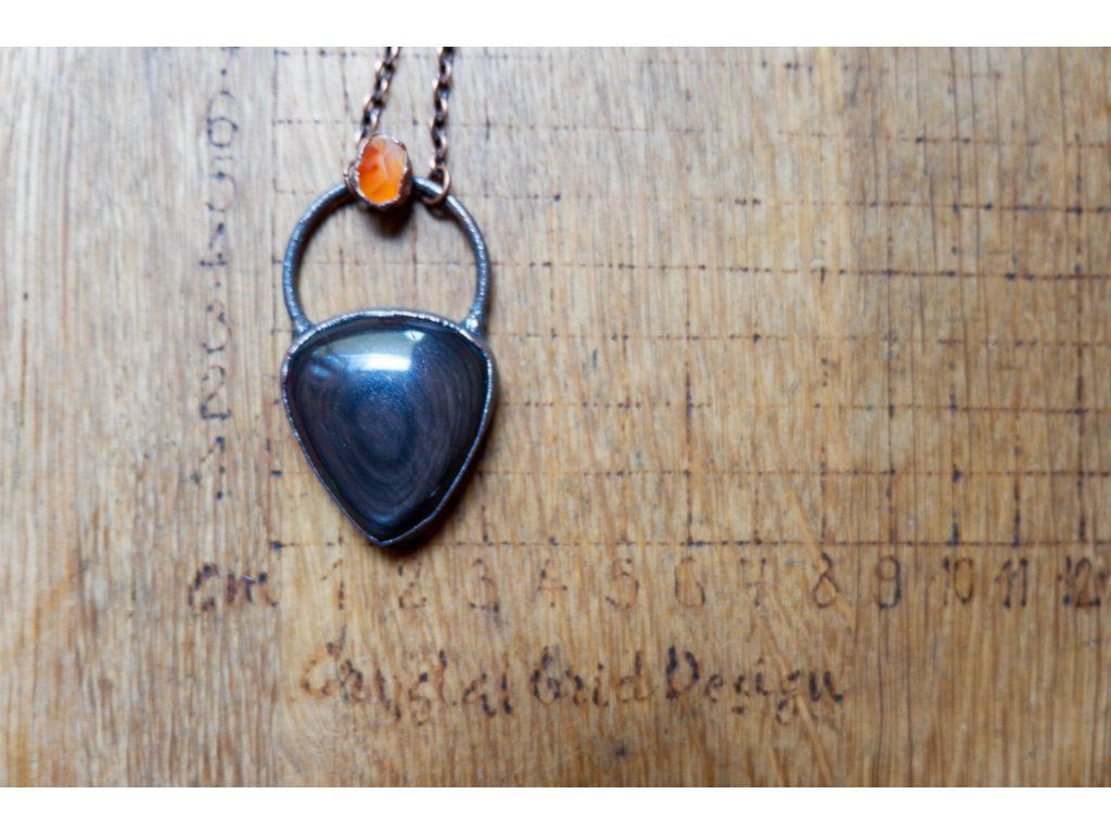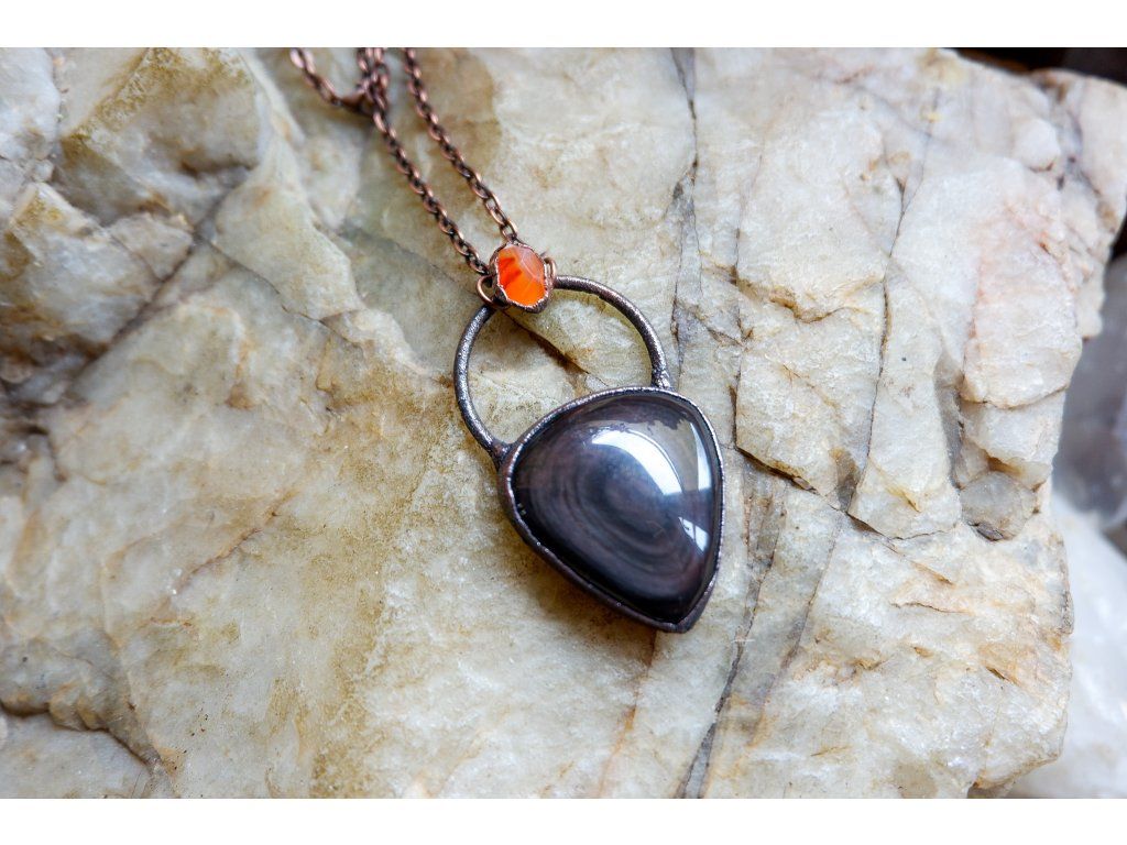 Přívěsek je vytvořený galvanizační technikou (electroforming) z mědi, karneolu a obsidiánu.