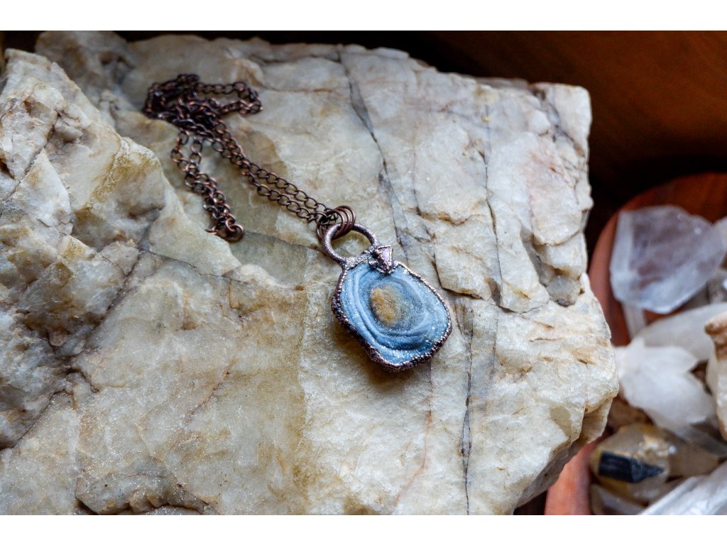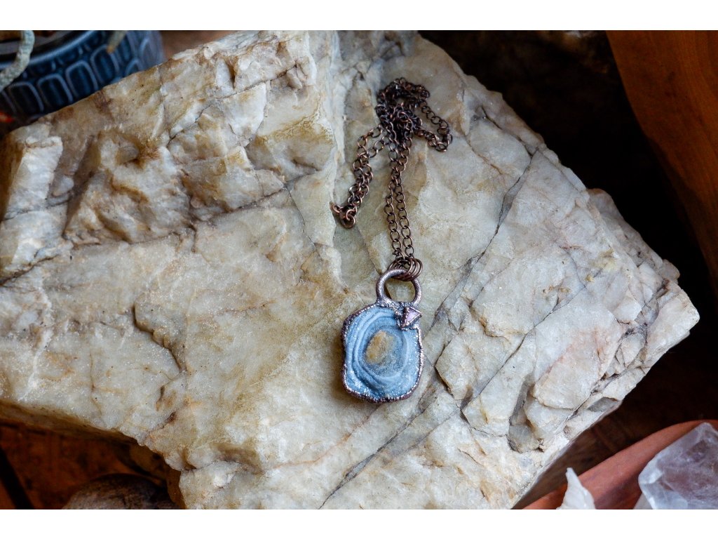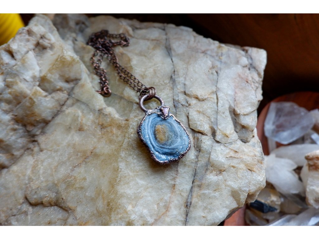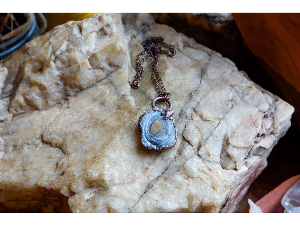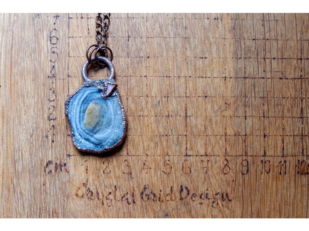 Přívěsek je zavěšen na měděném řetízku.