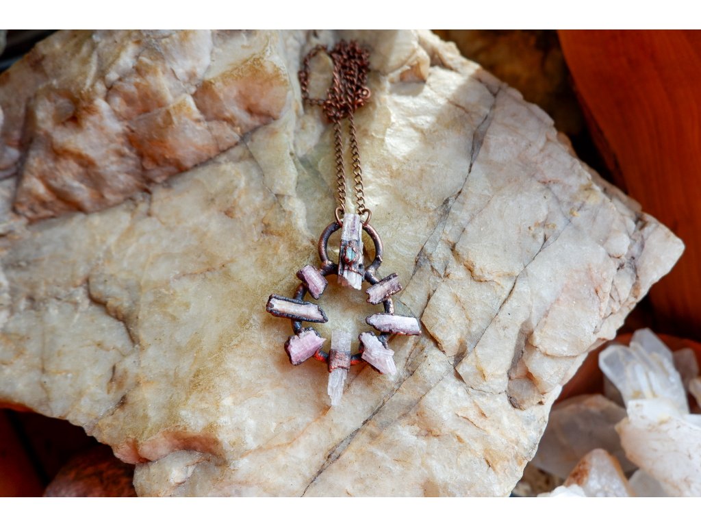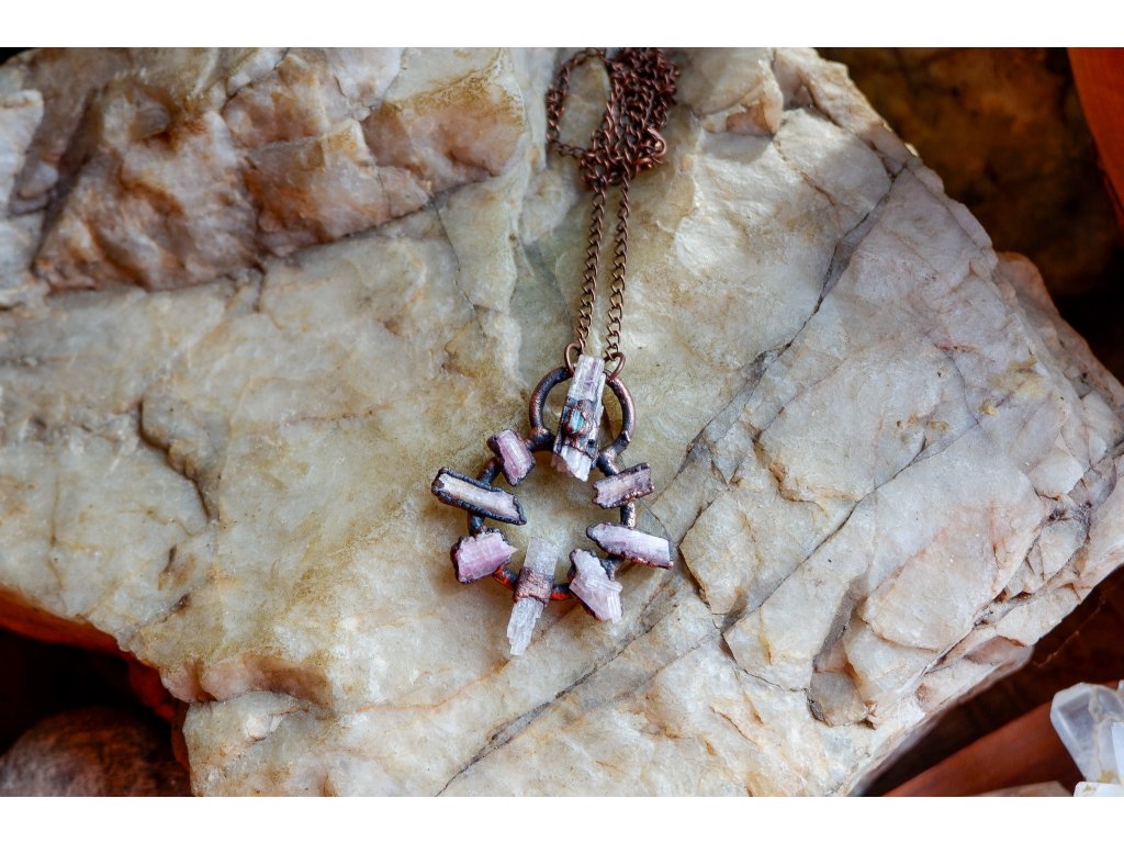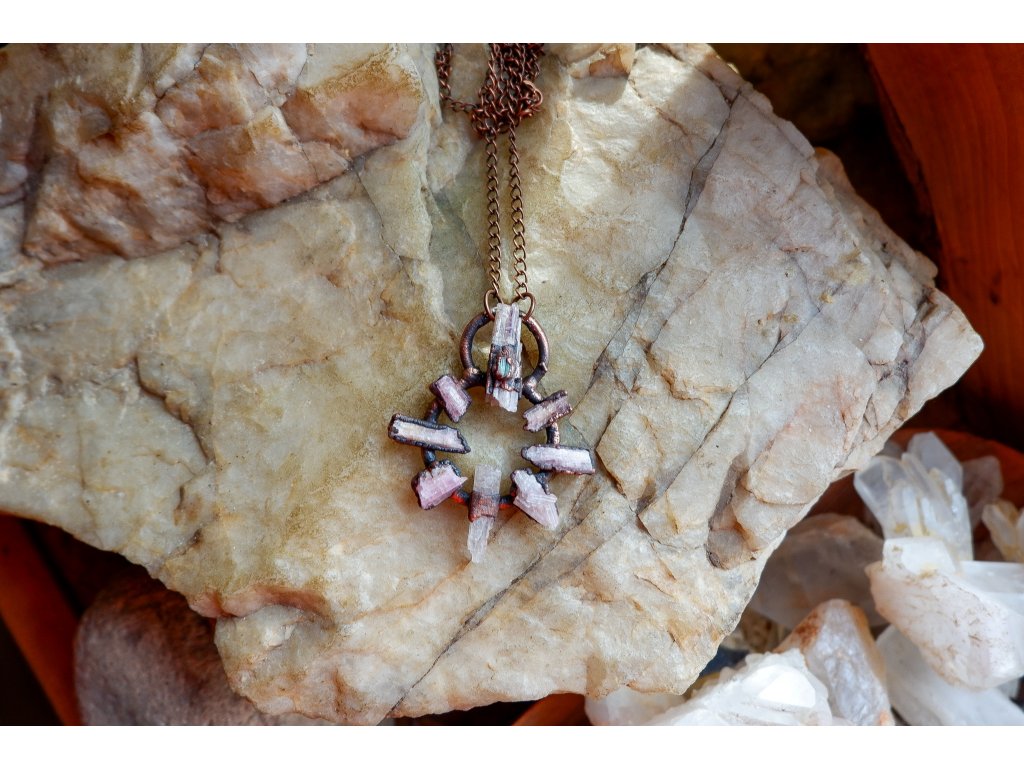 Přívěsek je vytvořený galvanizační technikou (electroforming) z mědi, růžového a zeleného turmalínu.