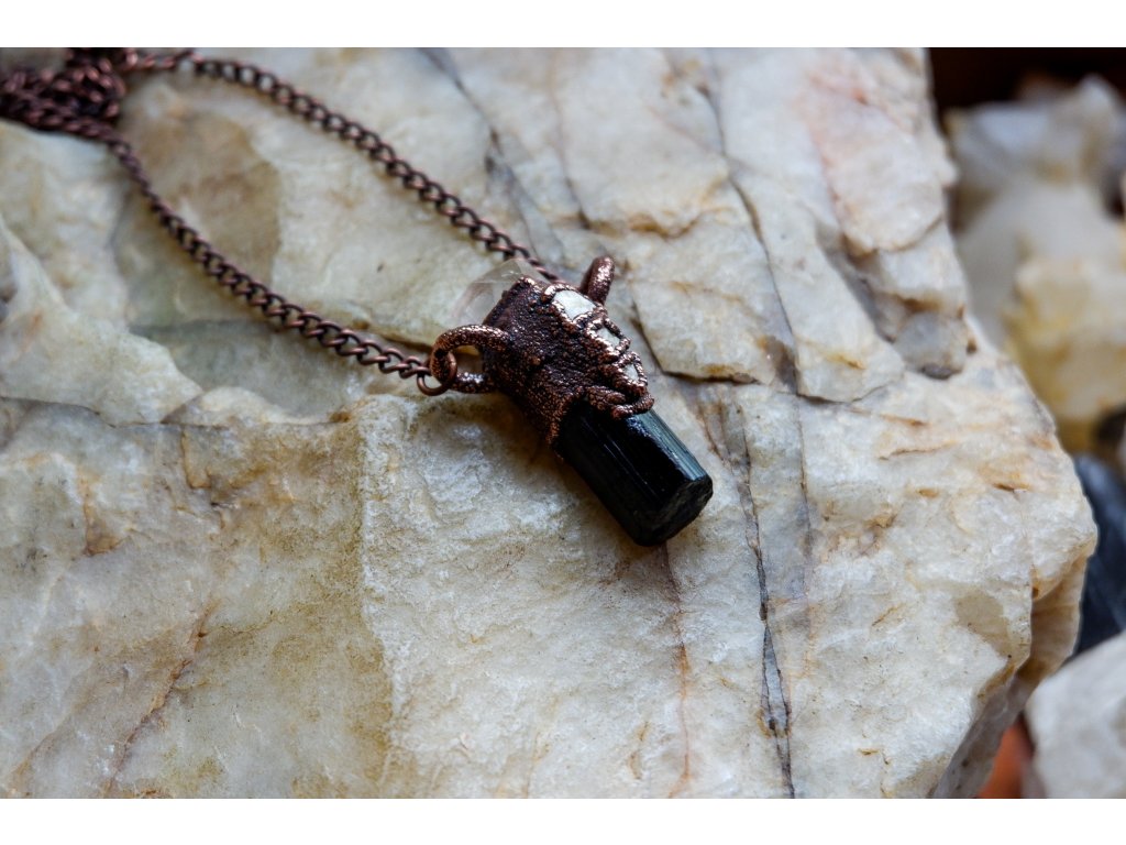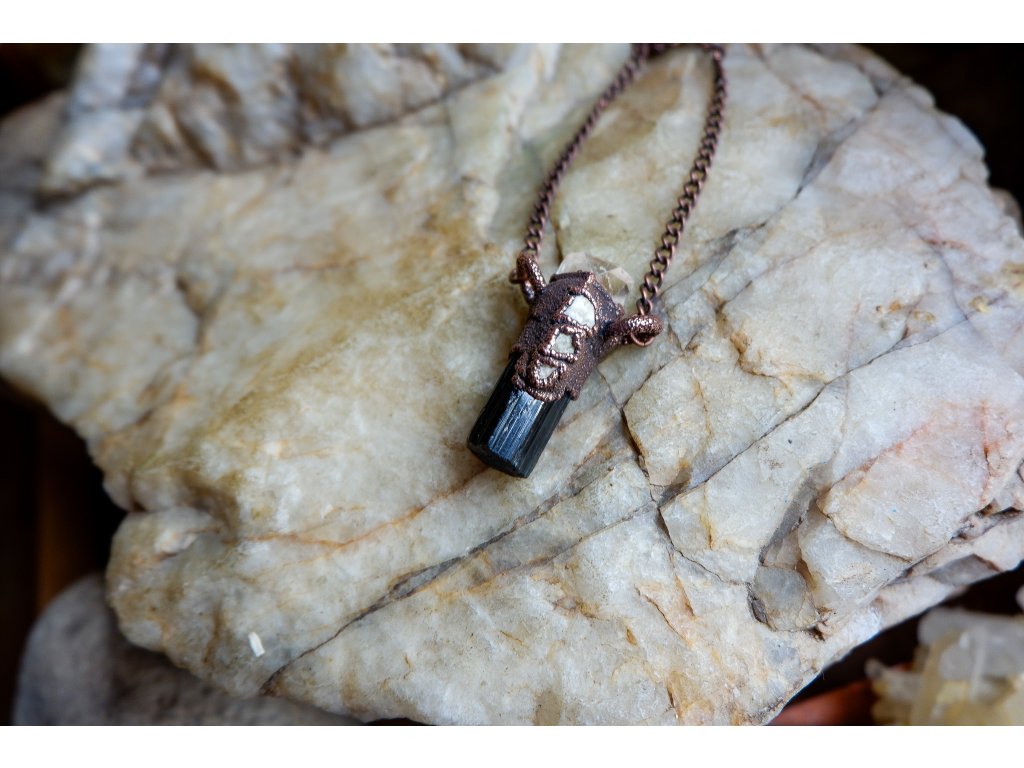 Přívěsek je vytvořený galvanizační technikou (electroforming) z mědi topazu, žlutých danburitů a černého turmalínu (skorylu).