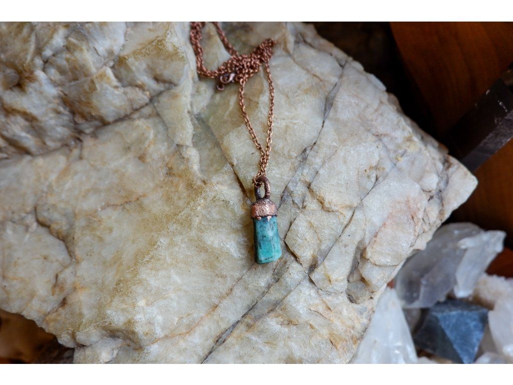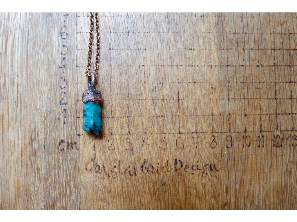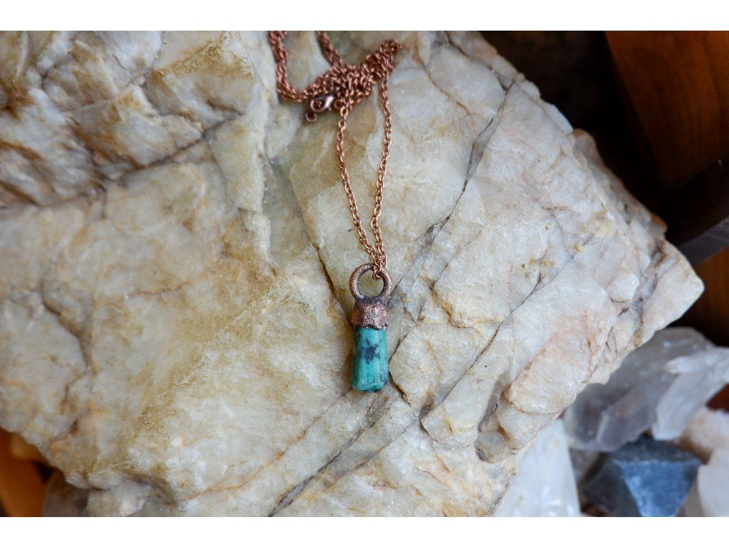 Přívěsek je vytvořený galvanizační technikou (electroforming) z mědi a smaragdu.