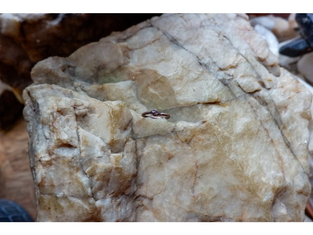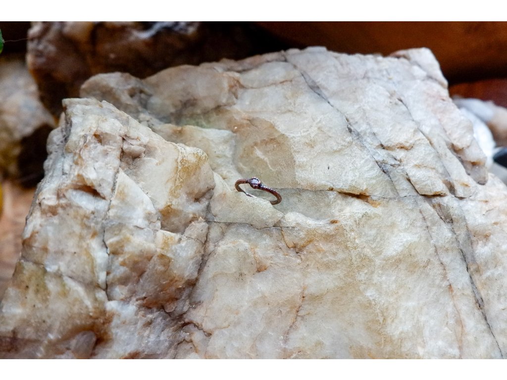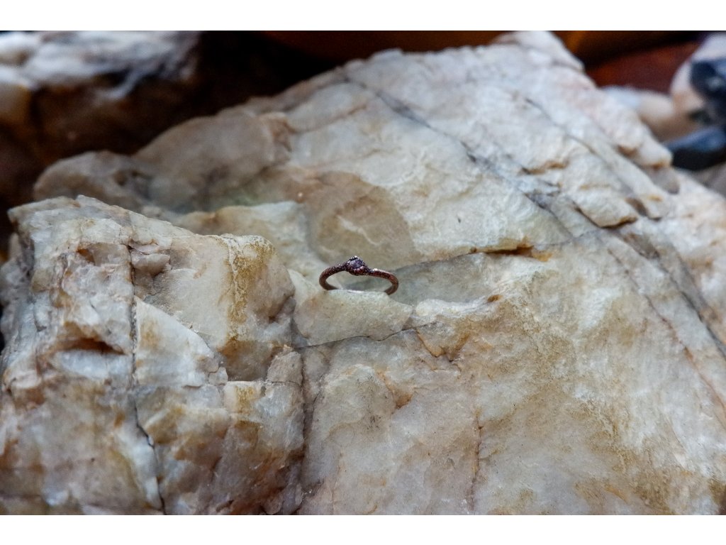 Prsten je vytvořen z růžových diamantů a mědi galvanizační technikou.