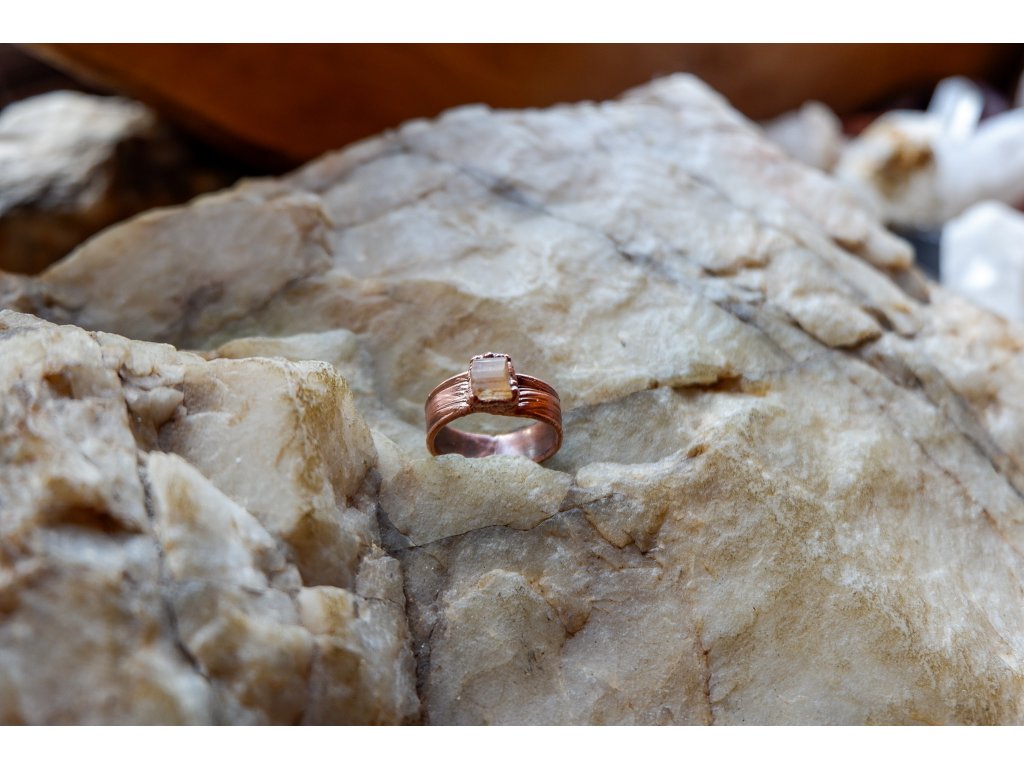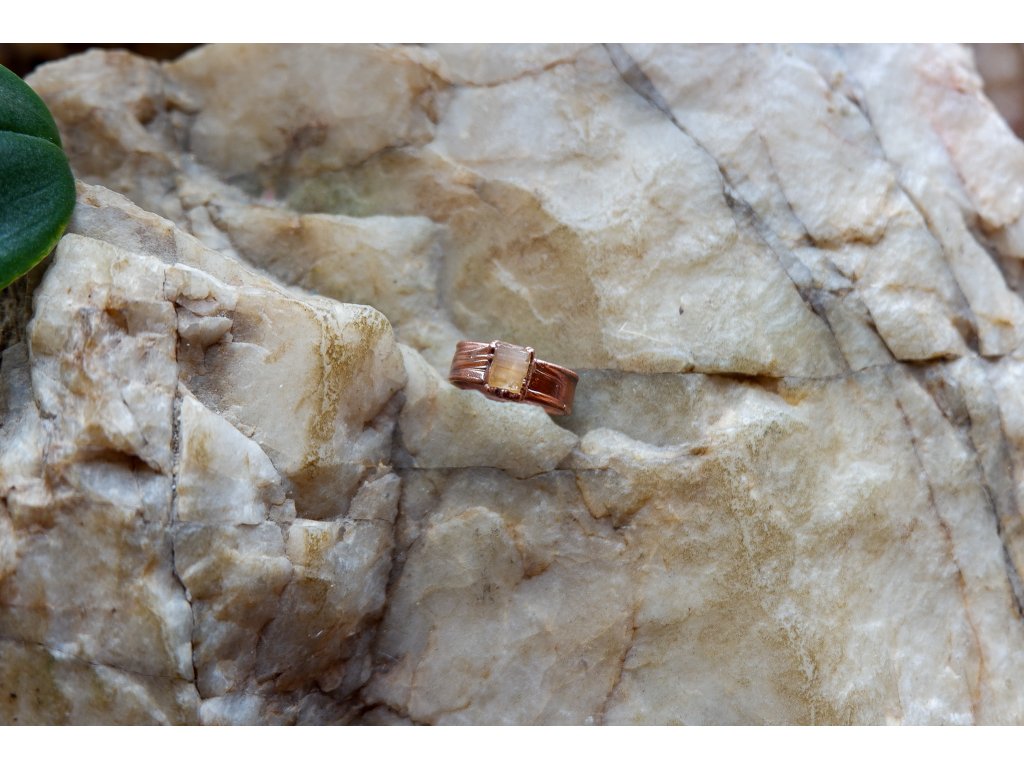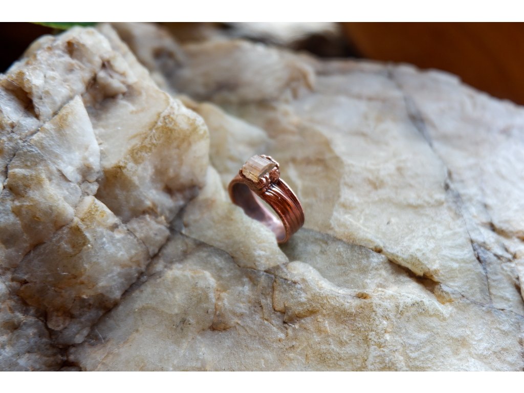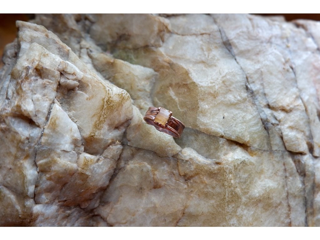 Prsten je vytvořen z  topazu a mědi technikou zvanou galvanoplastika.