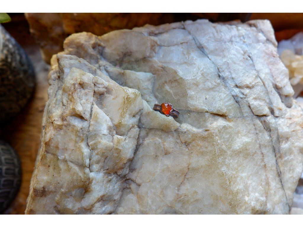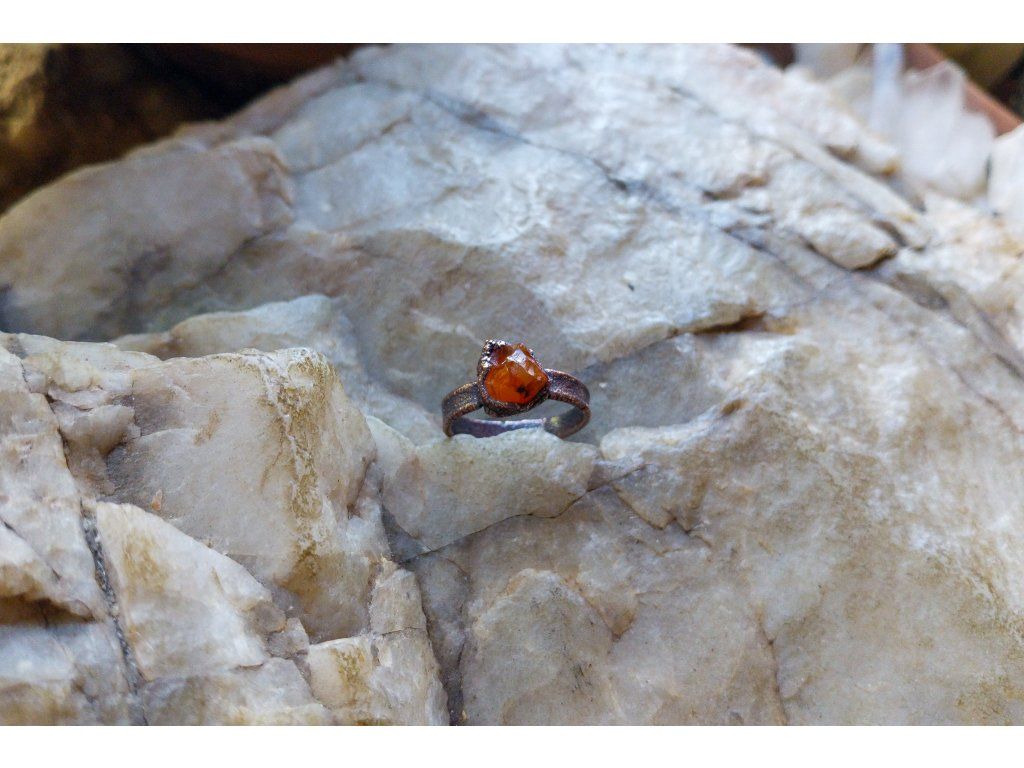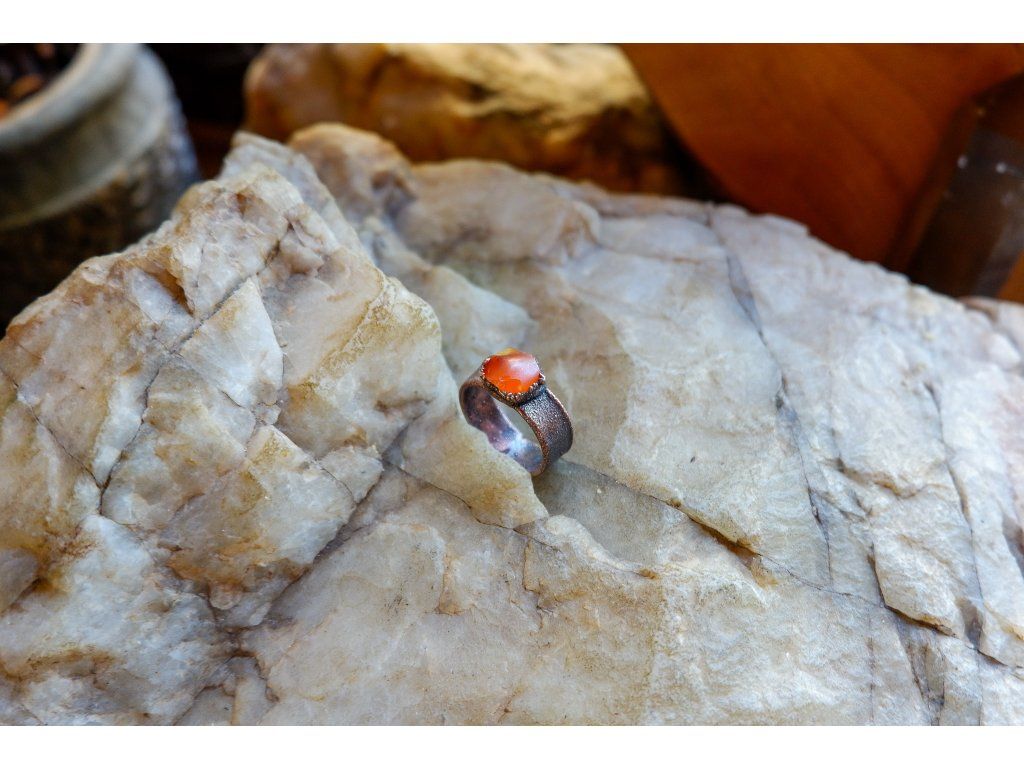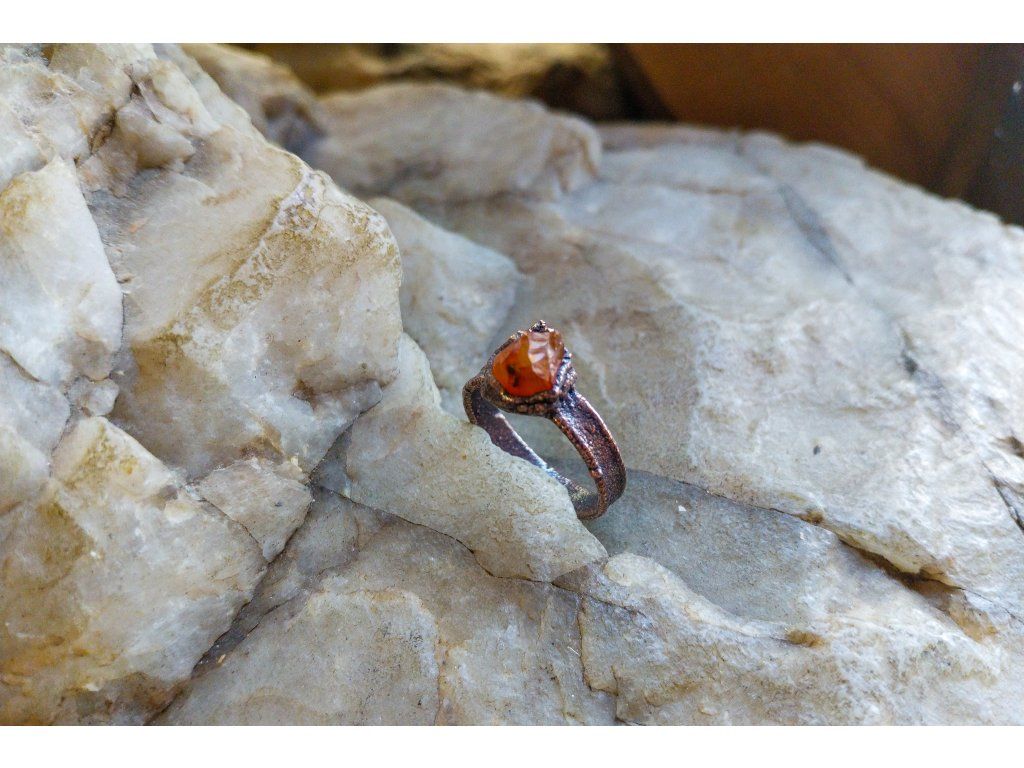 Prsten je vytvořený galvanizační technikou z mědi a karneolu.