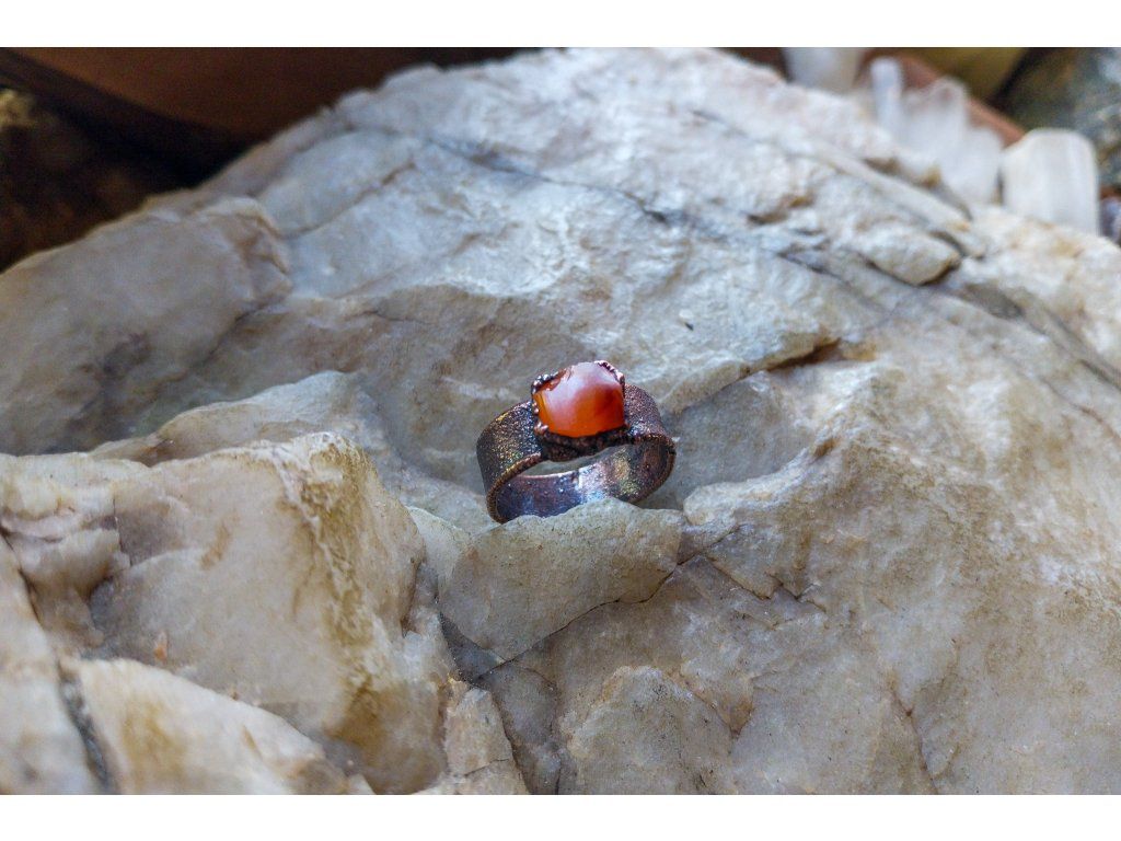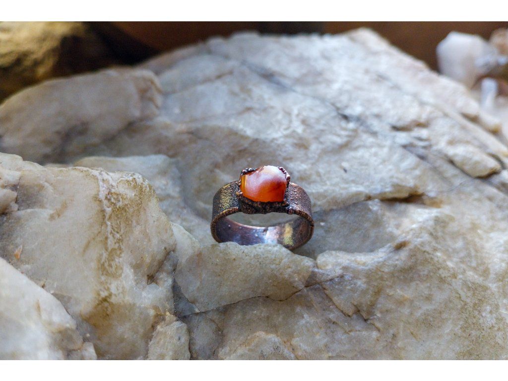 Prsten je vytvořený galvanizační technikou z mědi a karneolu.