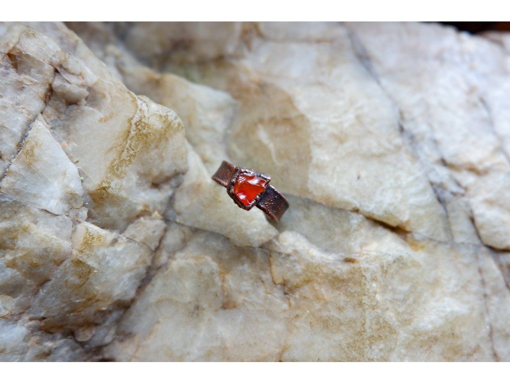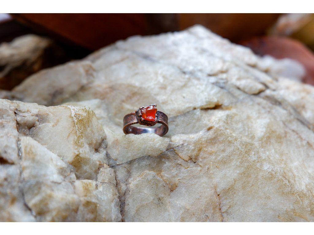 Prsten je vytvořený galvanizační technikou z mědi a karneolu.