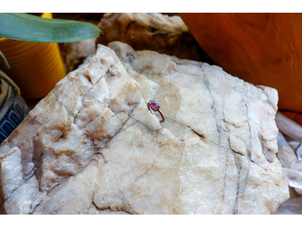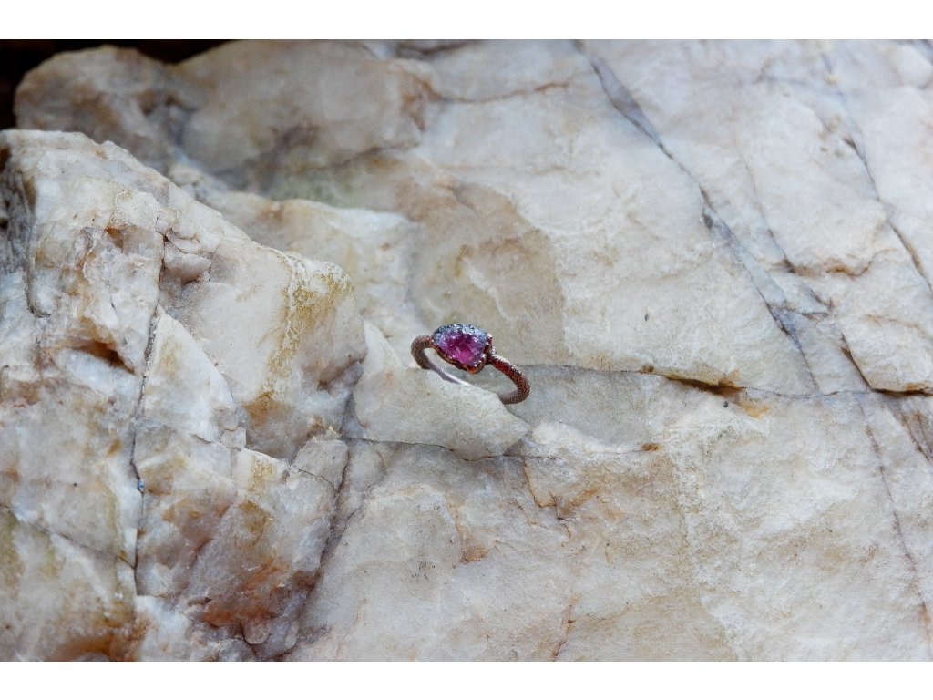 Prsten je vytvořen z melounového turmalínu a mědi galvanizační technikou.