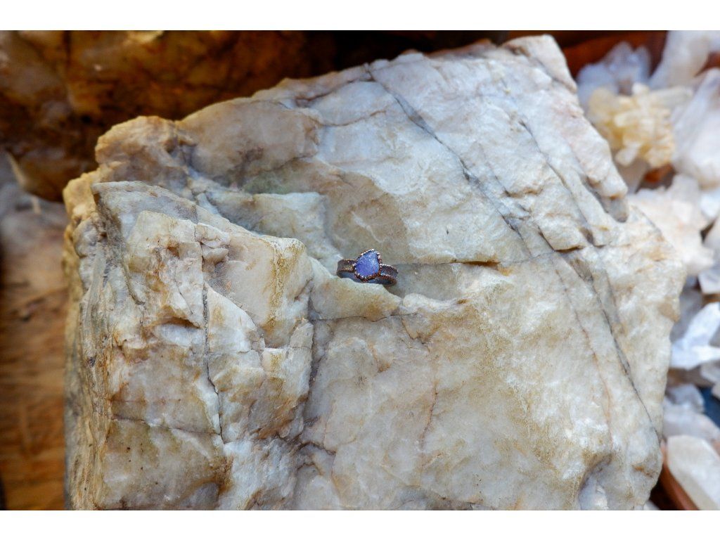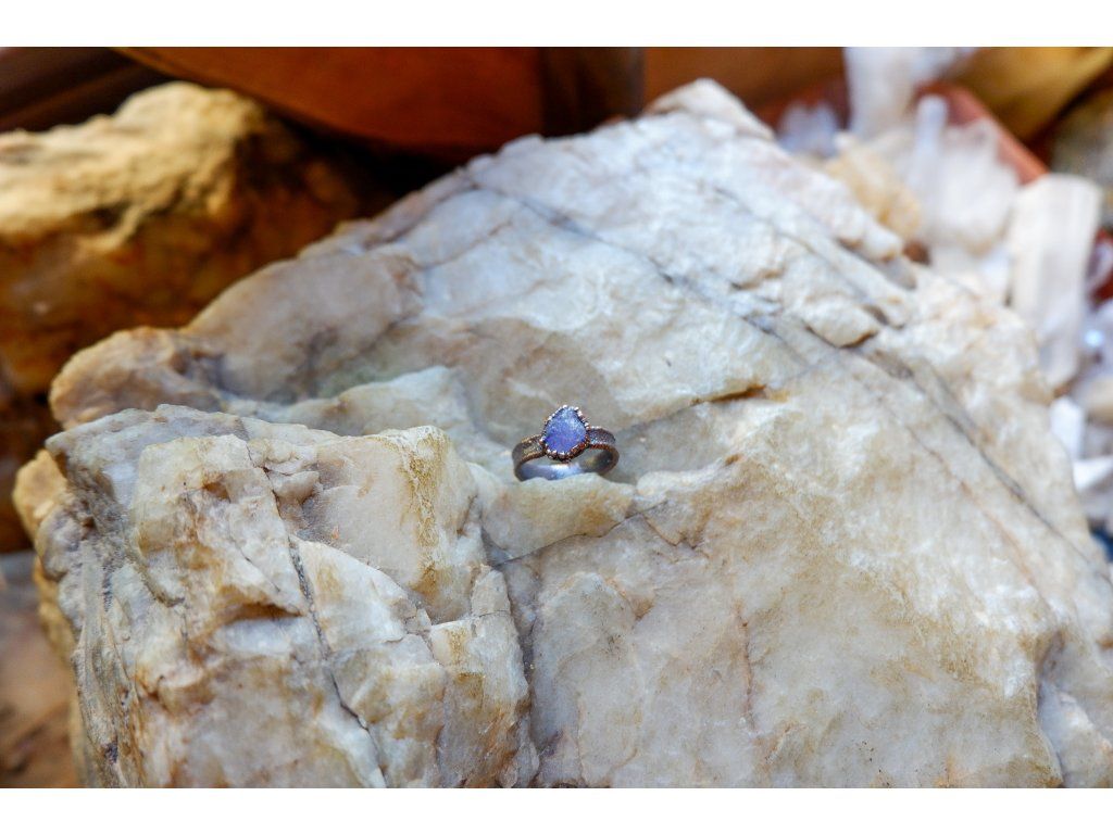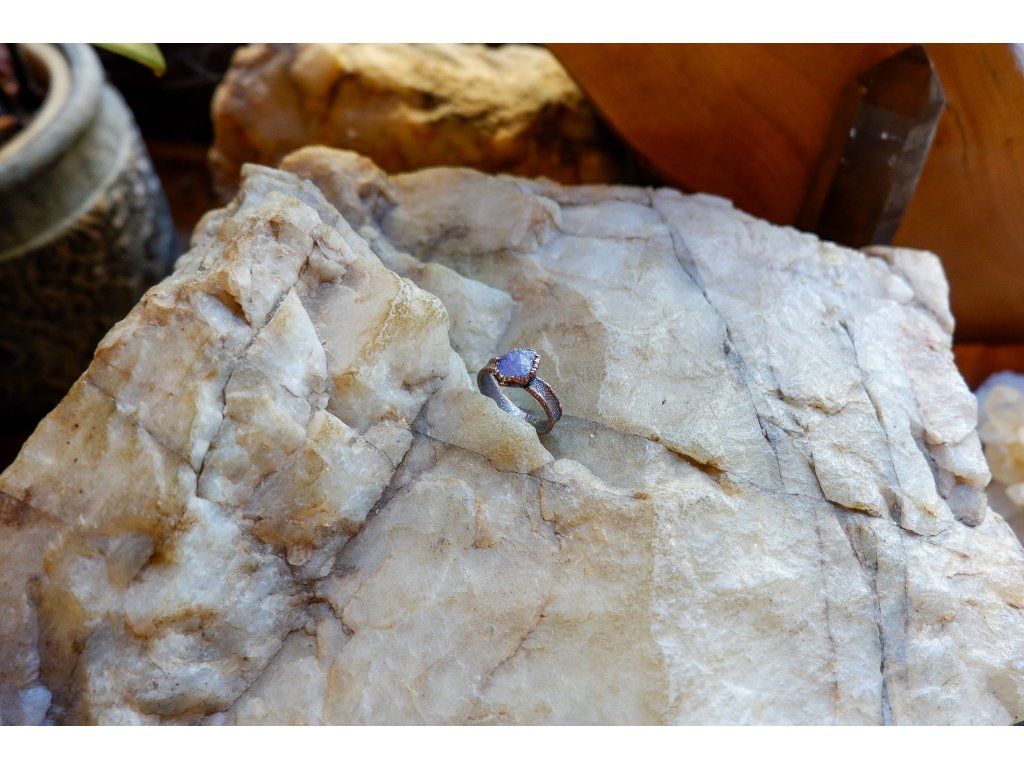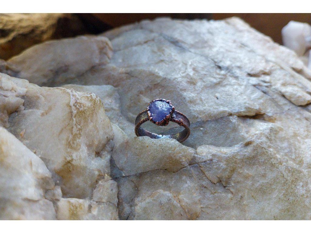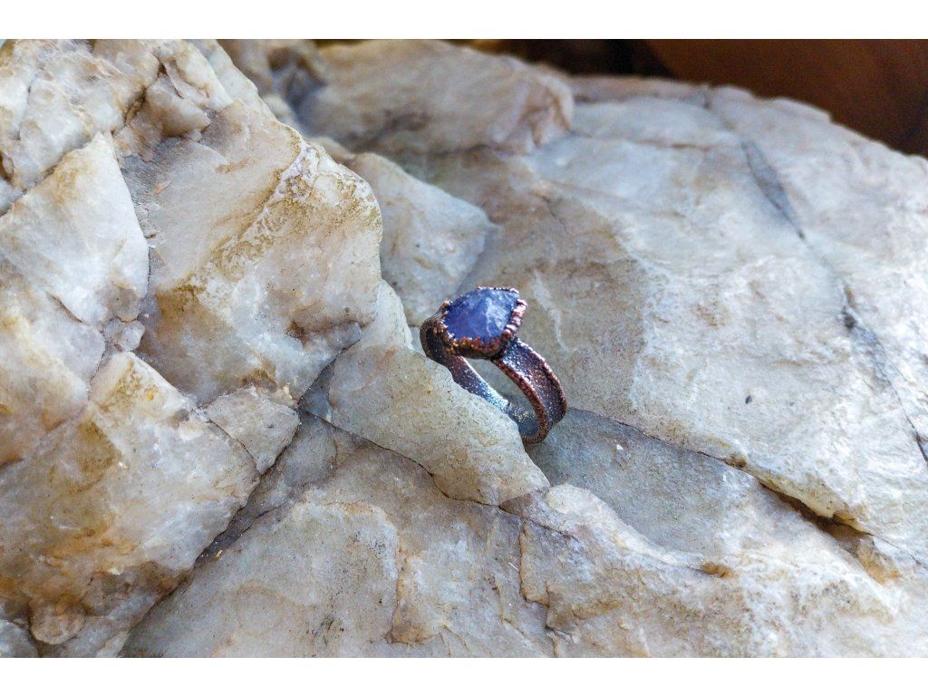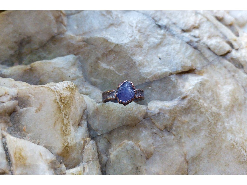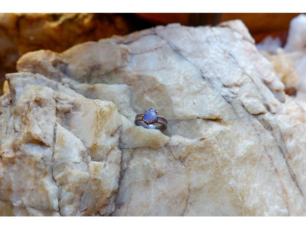 Prsten je vytvořený galvanizační technikou z mědi a tanzanitu.