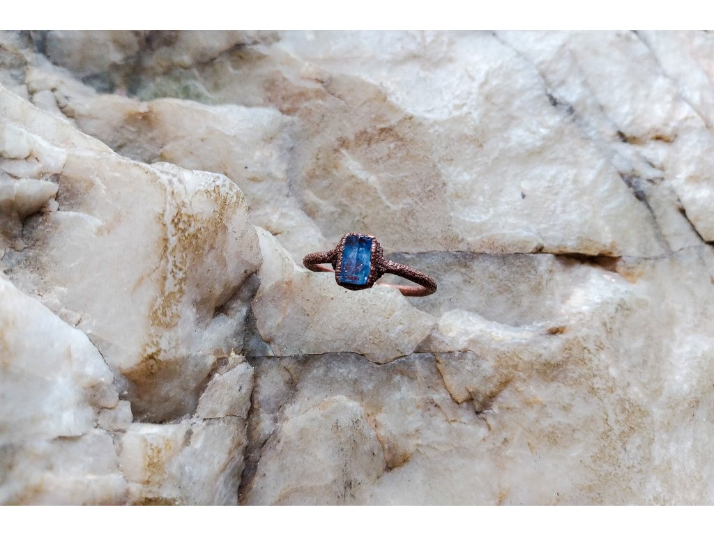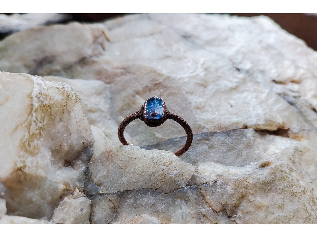 Prsten je vytvořený galvanizační technikou z mědi a safíru.