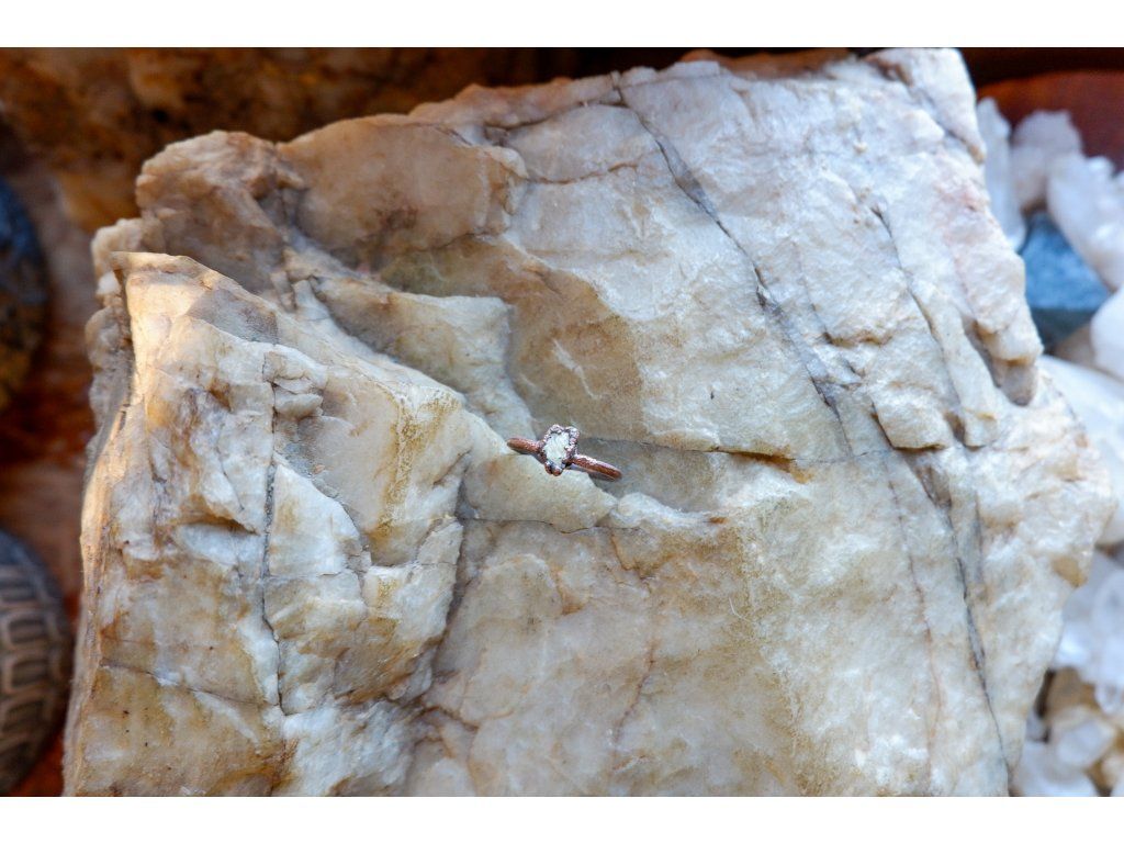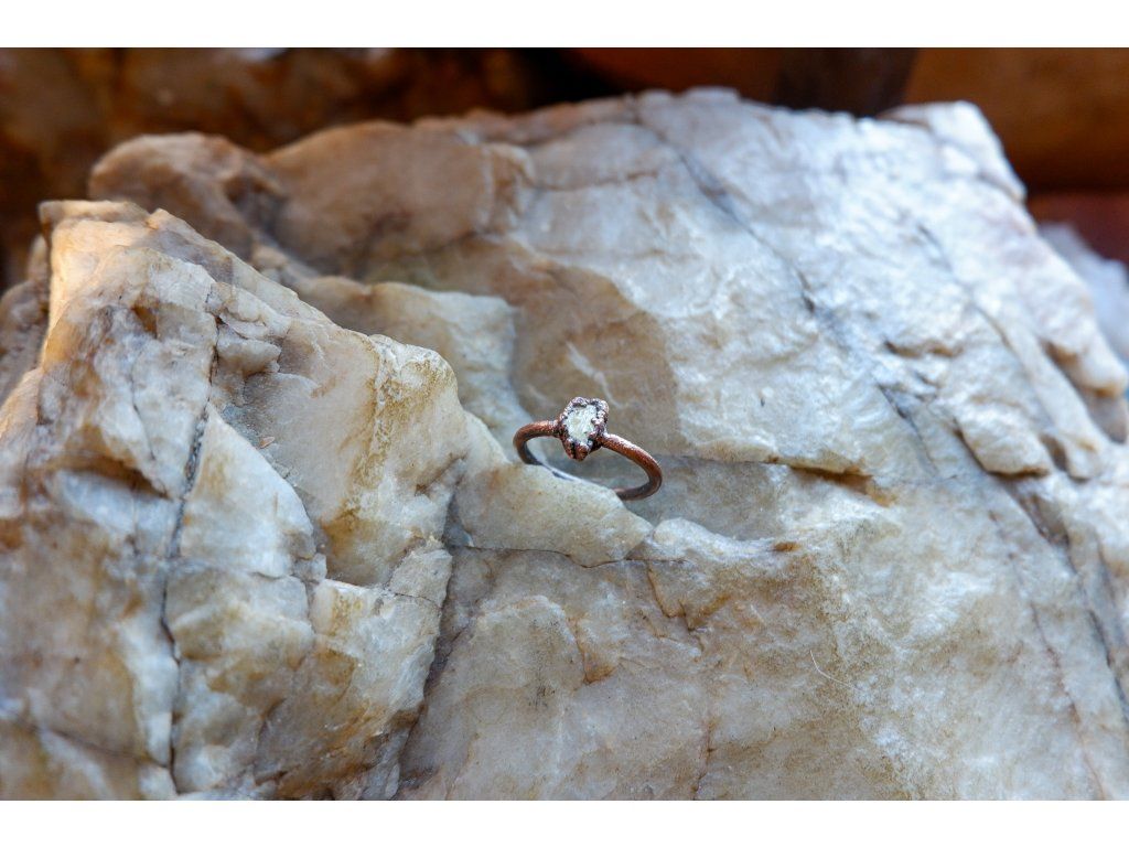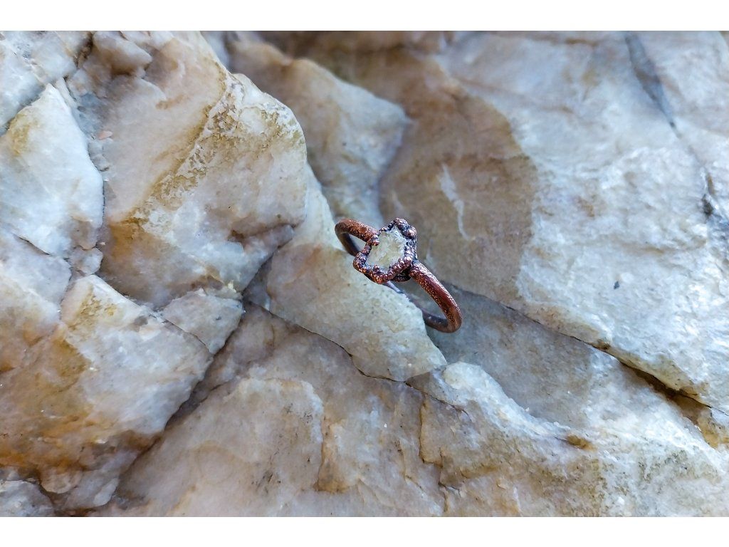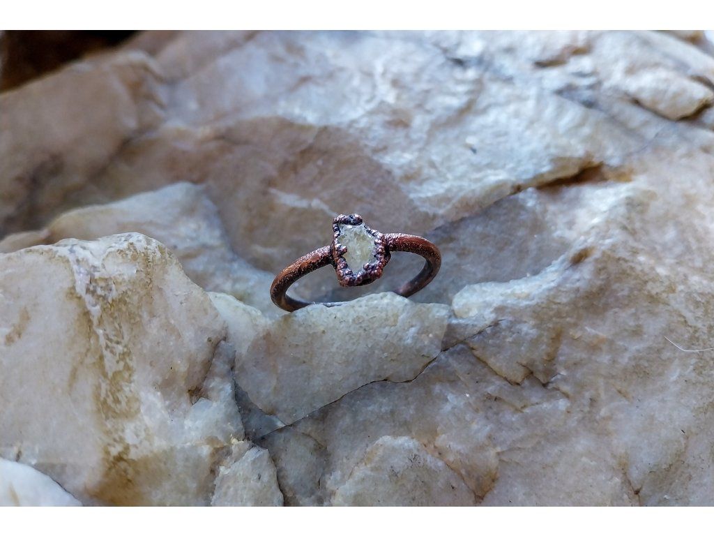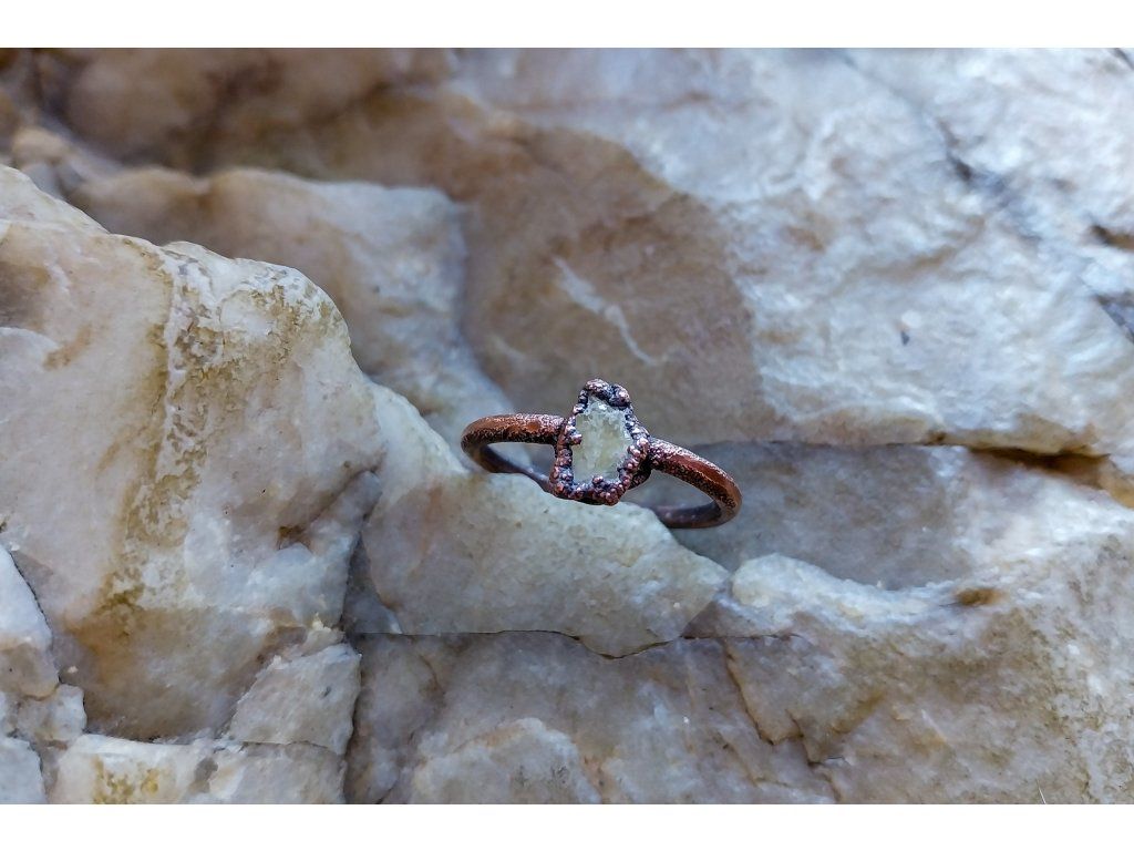 Prsten je vytvořen z žlutého danburitu a mědi galvanizační technikou.