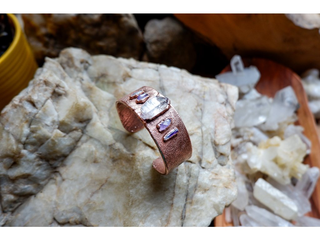 Náramek je vytvořený galvanizační technikou (electroforming) z mědi a ametystů.