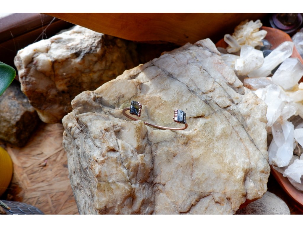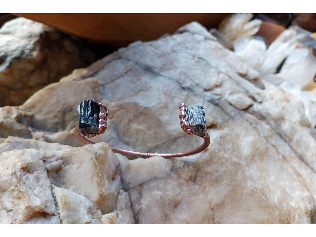 Náramek je vytvořený z černých turmalínů a mědi galvanizační technikou.