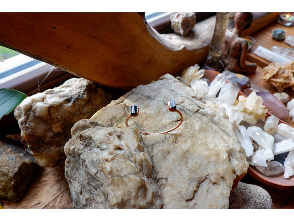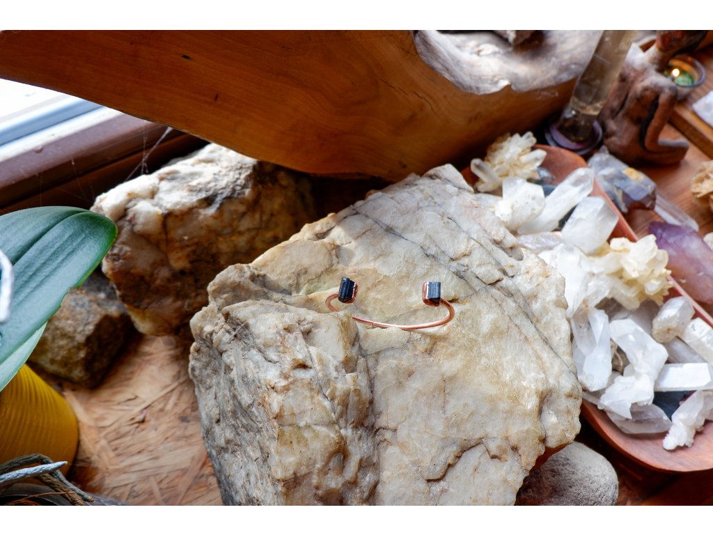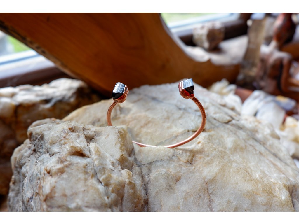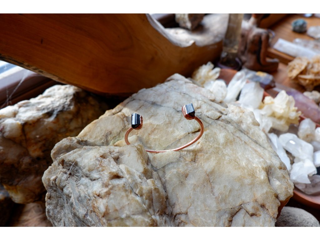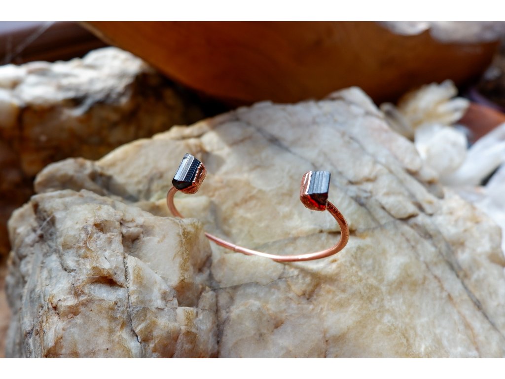 Náramek je vytvořený z černých turmalínů a mědi galvanizační technikou.