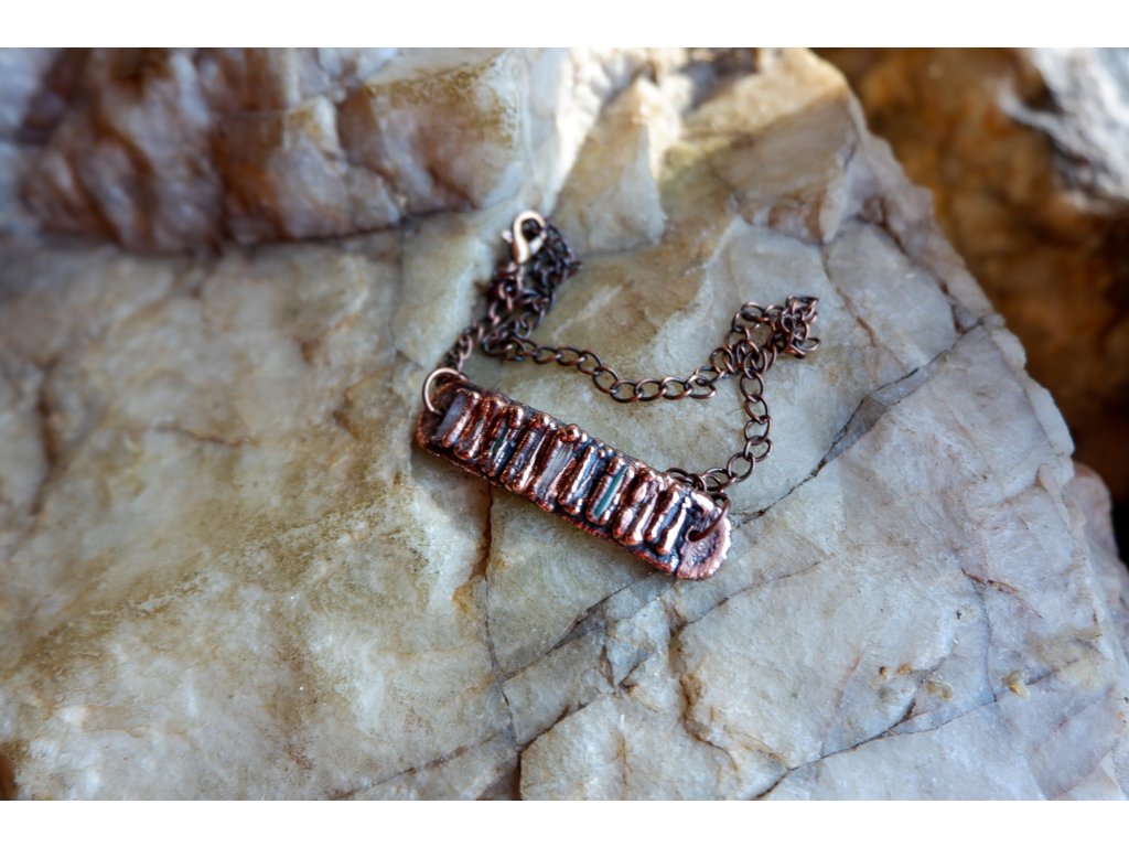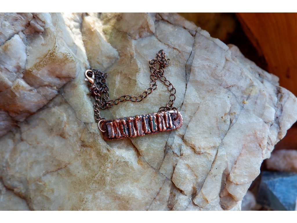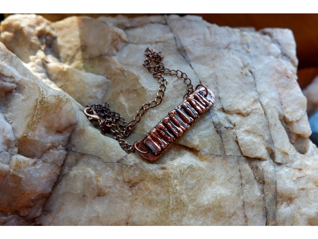 Náramek je vytvořený ze zelených a růžových turmalínů a mědi galvanizační technikou.