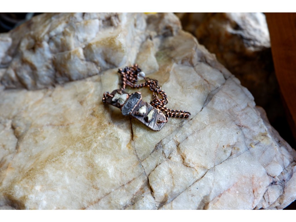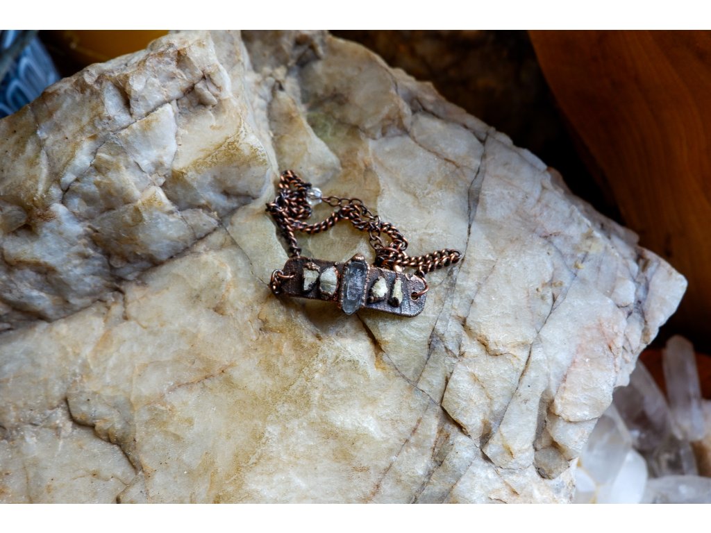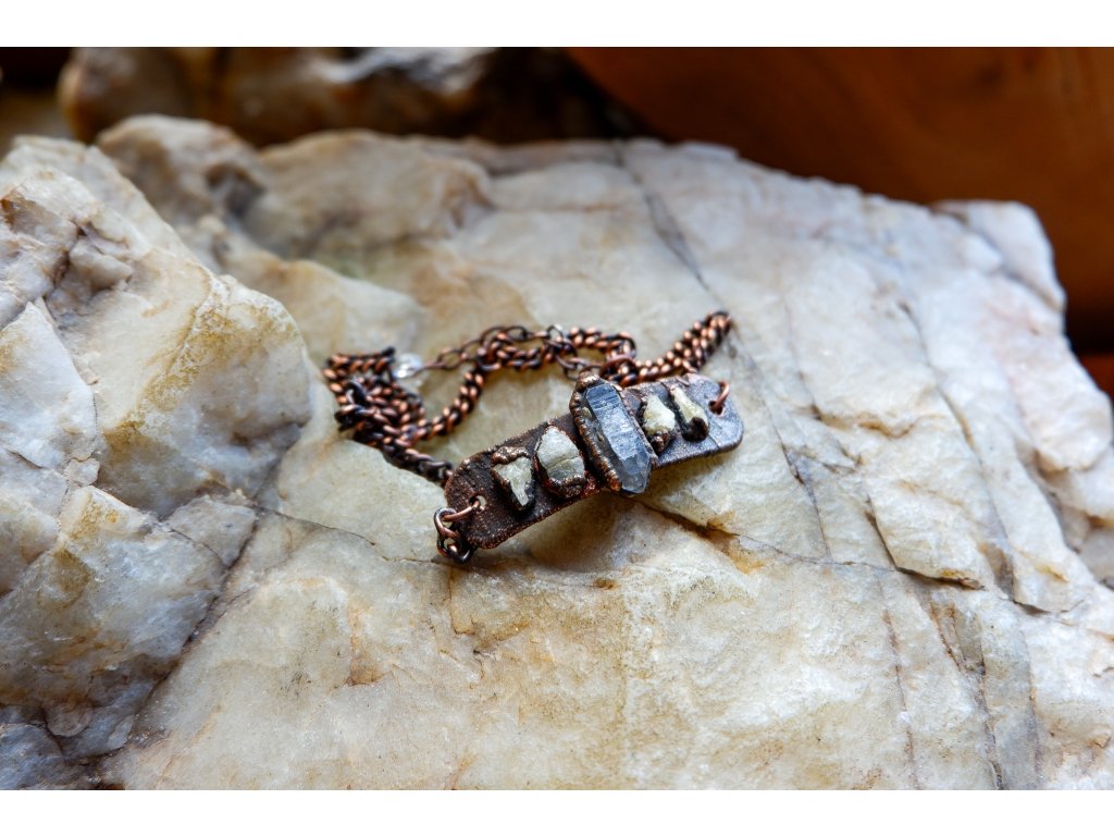 Náramek je vytvořený galvanizační technikou (electroforming) z mědi žlutého danburitu a tibetského křišťálu.