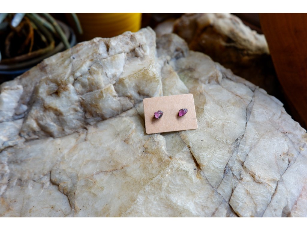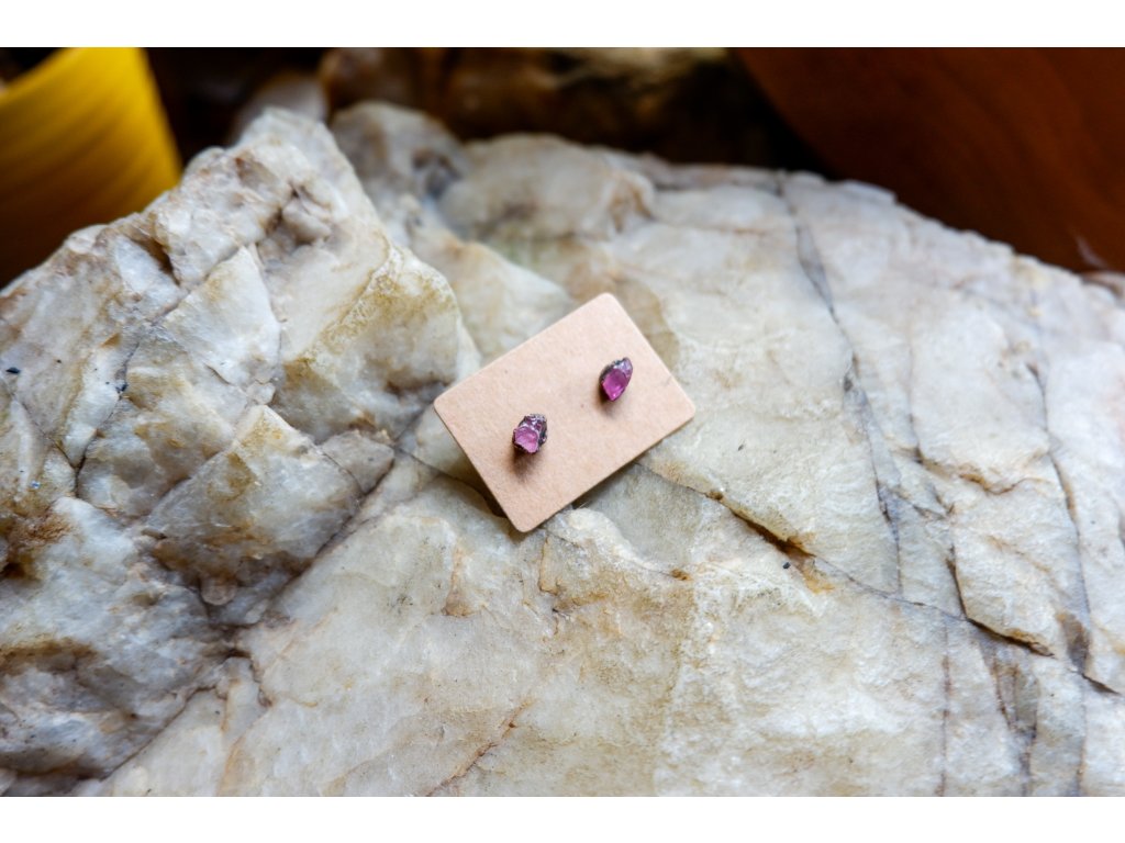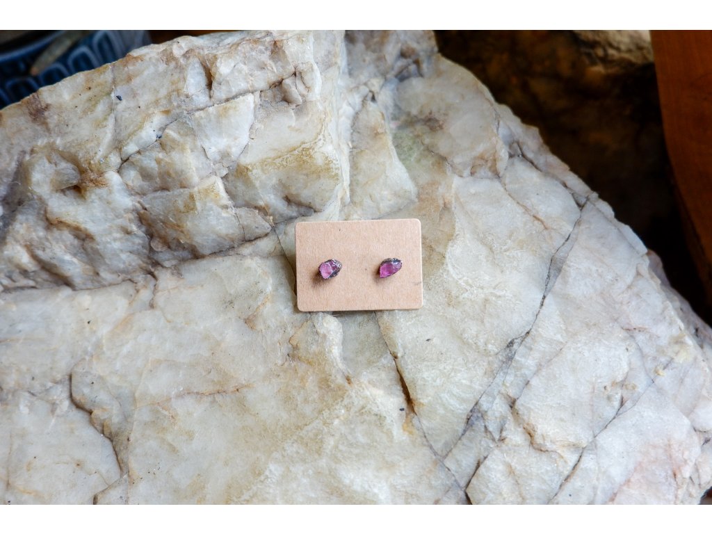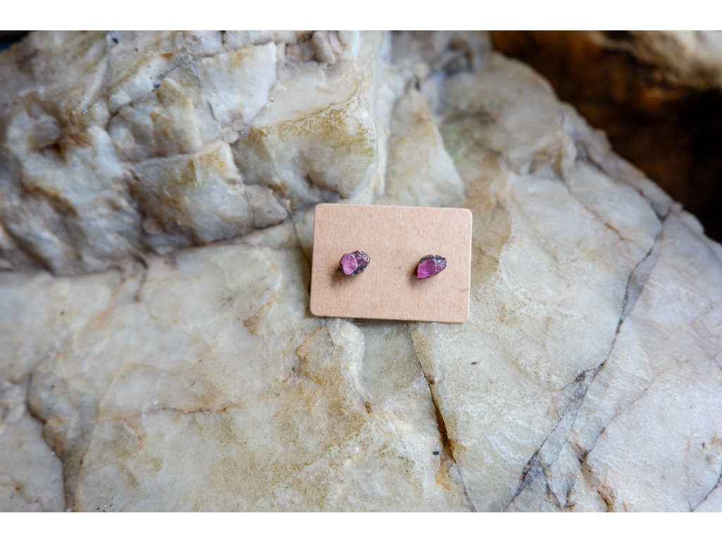 Náušnice jsou vytvořené galvanizační technikou z mědi a růžových turmalínů, puzety jsou z chirurgické oceli.
