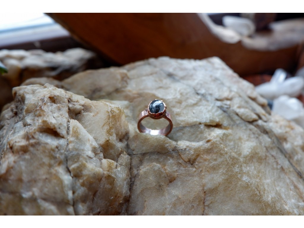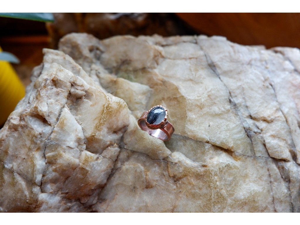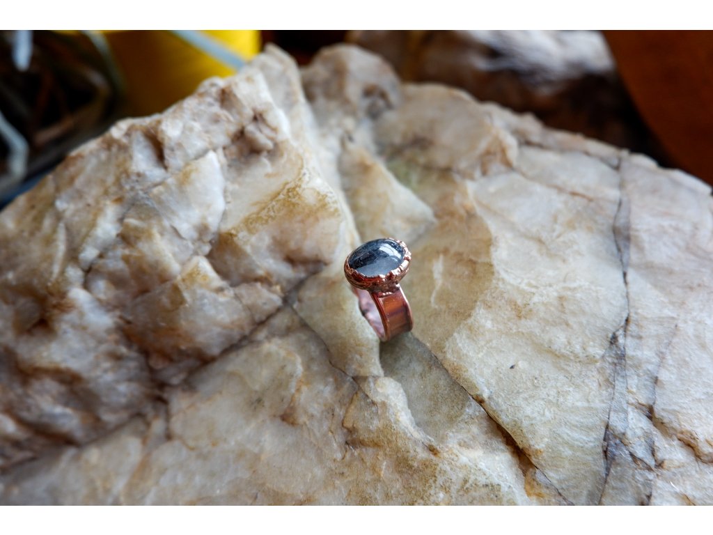 Prsten je vytvořený galvanizační technikou (electroforming) z mědi a křišťálu s inkluzí skorylu.