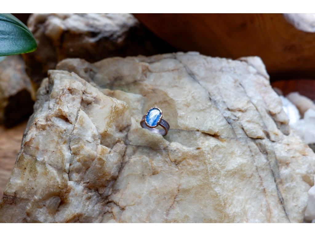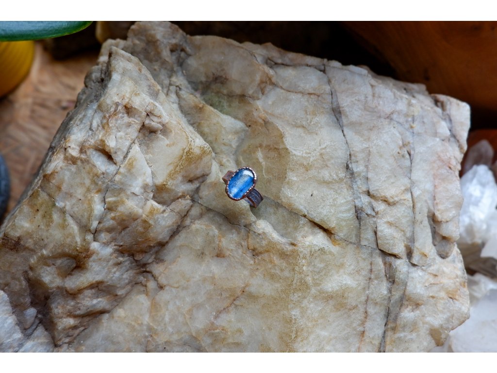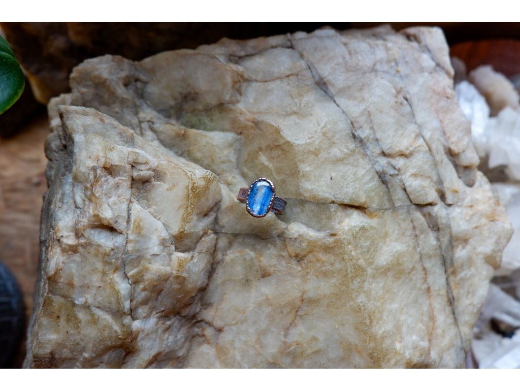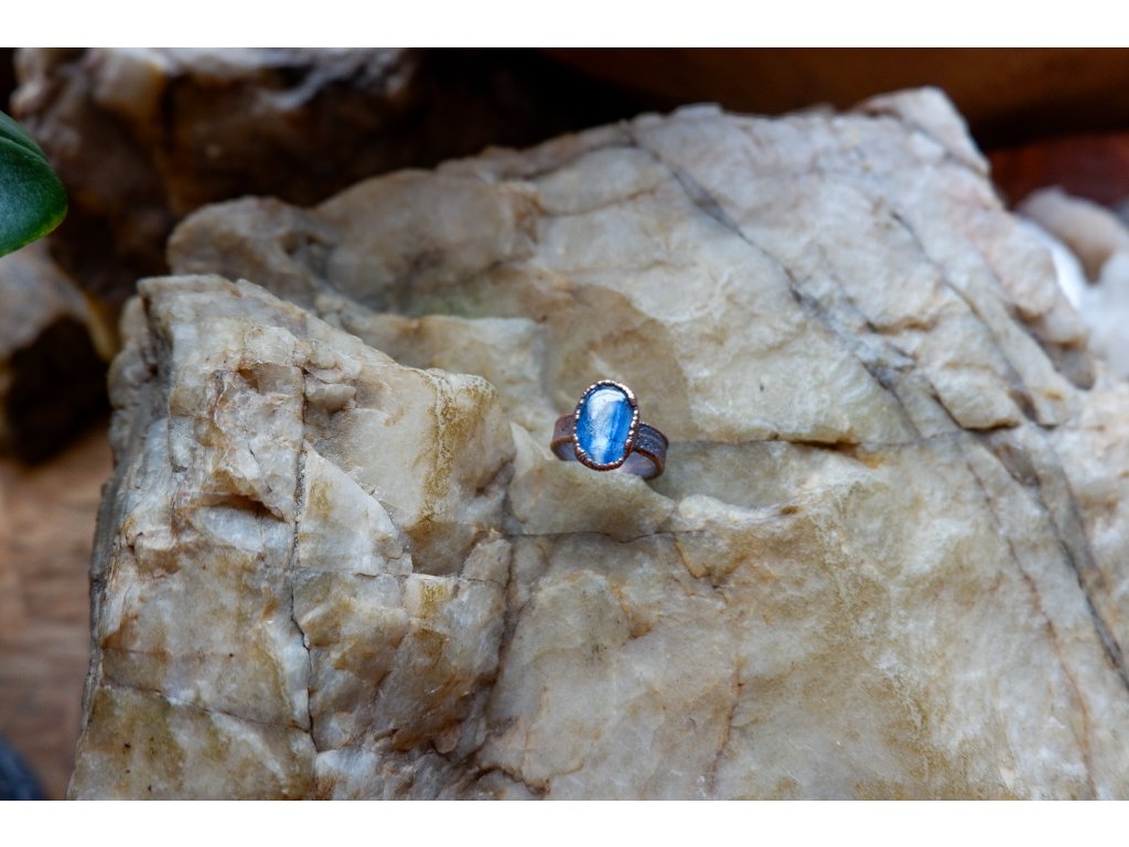 Prsten je vytvořený galvanizační technikou (electroforming) z mědi a kyanitu.