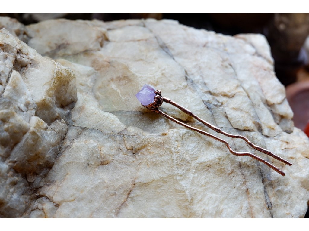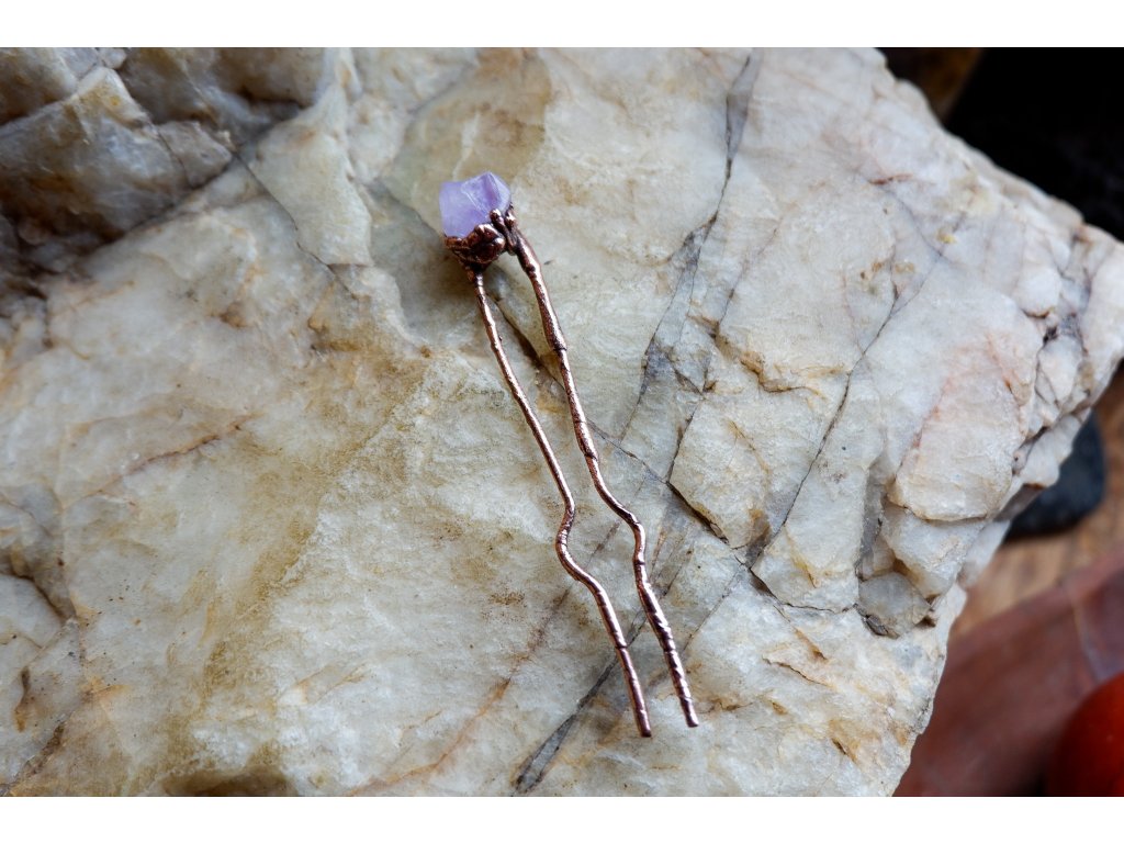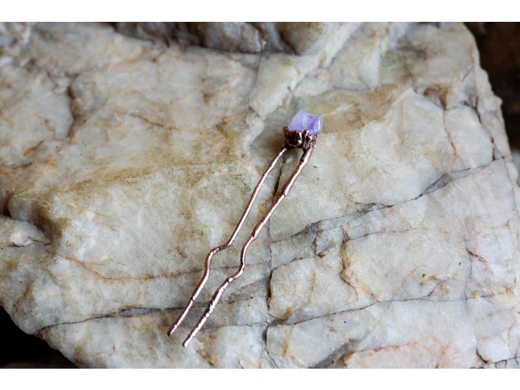 Sponka je vytvořená galvanizační technikou (electroforming) z mědi a ametystu.