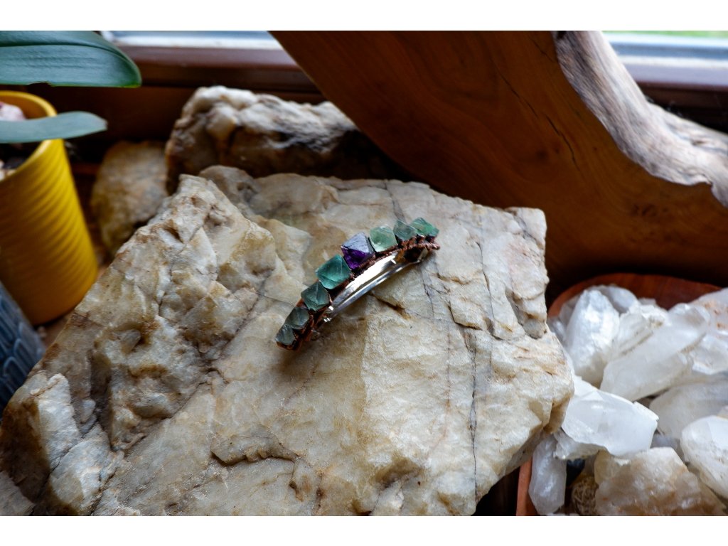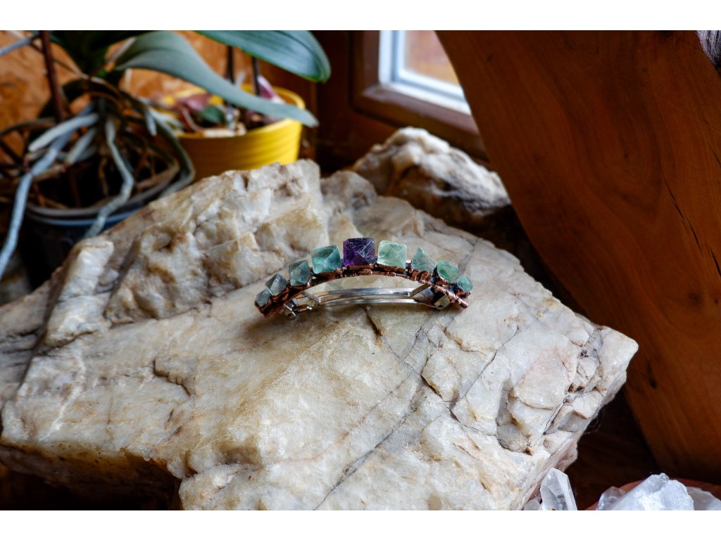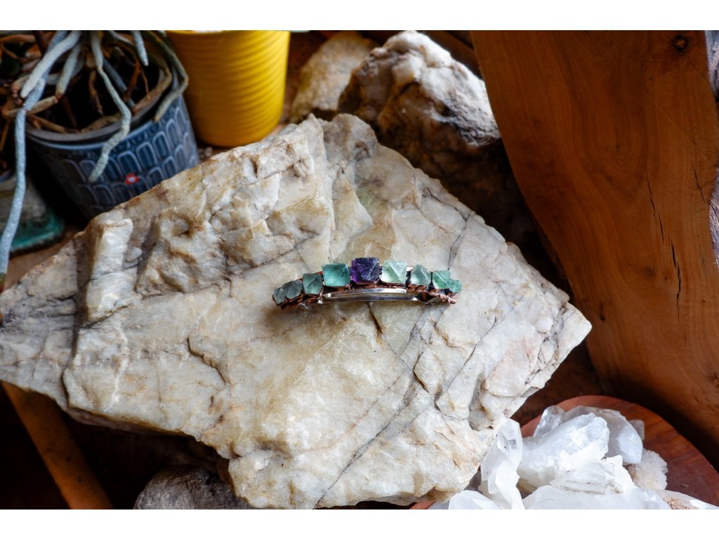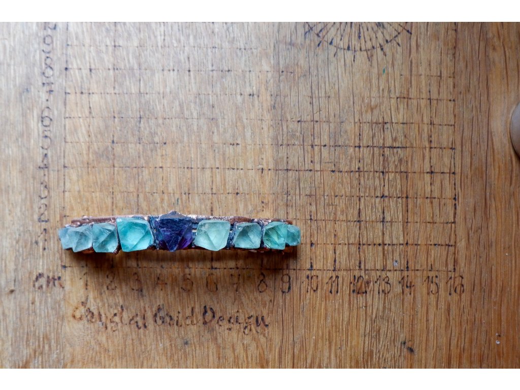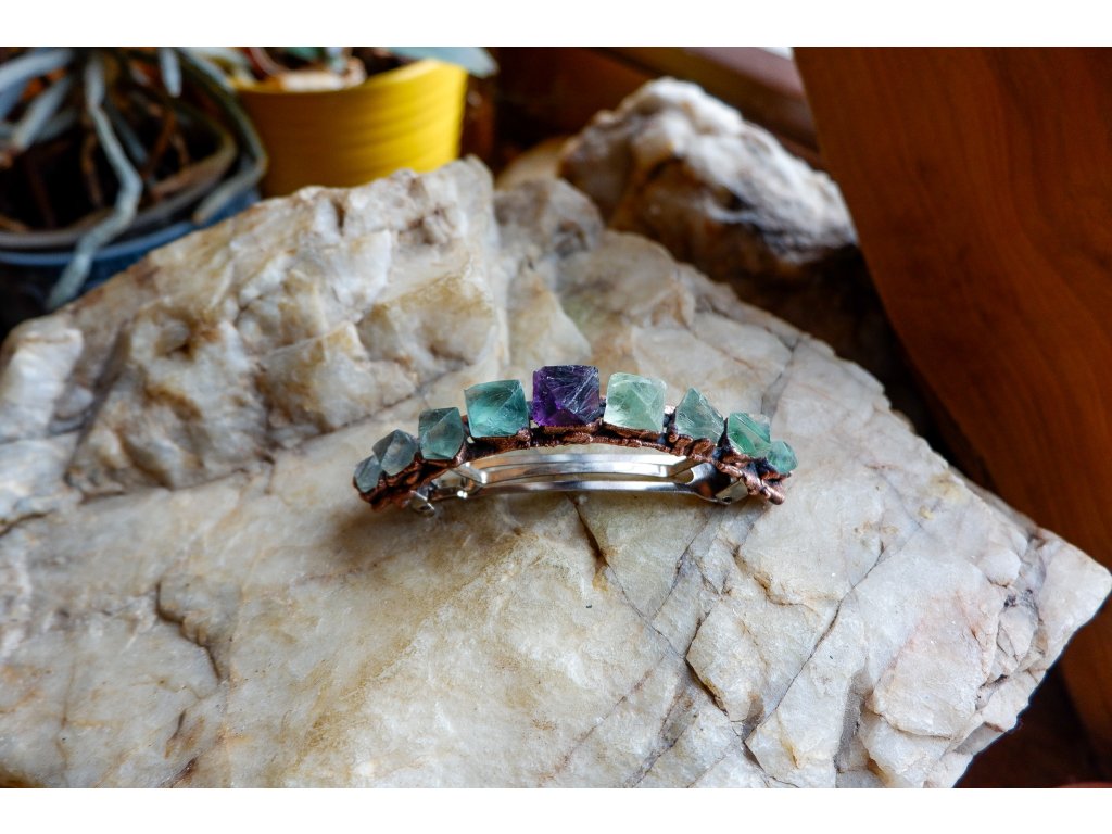 Sponka je vytvořená galvanizační technikou (electroforming) z mědi a fluoritu, velikost sponky je 9cm.
